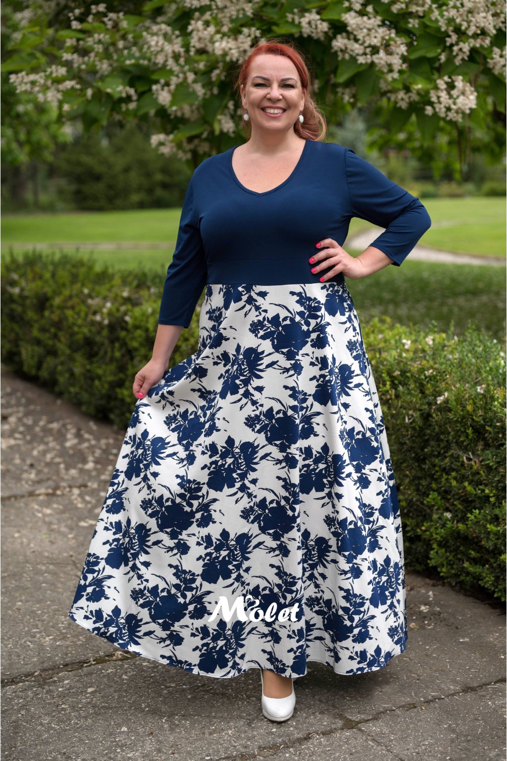 Maxi šaty s 3/4 rukávem a výstřihem do Vé. Sukně je šitá do áčka a je z krásné lehké látky. Vrchní díl se středovým pásem je modré látky. Šaty nemají zip. Jsou pružné. Krásný model, který se Vám zalíbí a okouzlíte v něm i Vaše okolí.