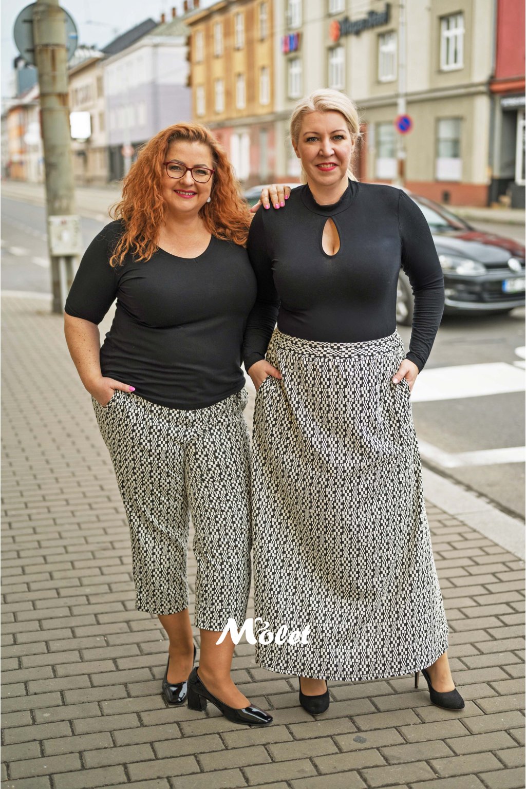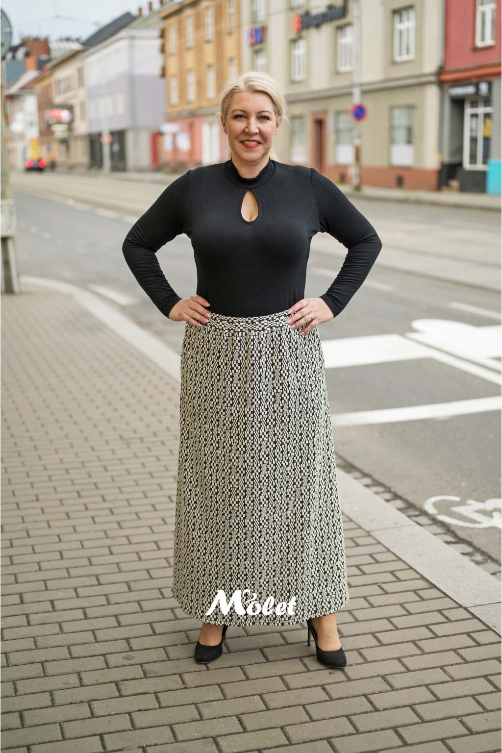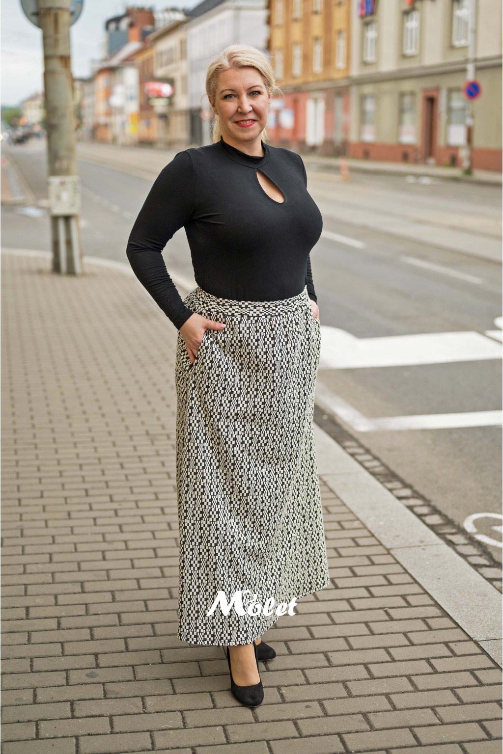 Skvělá sukně v maxi délce s jemným černobílým vzorečkem s kapsami. V pase je sukně na gumu a nemá zip.