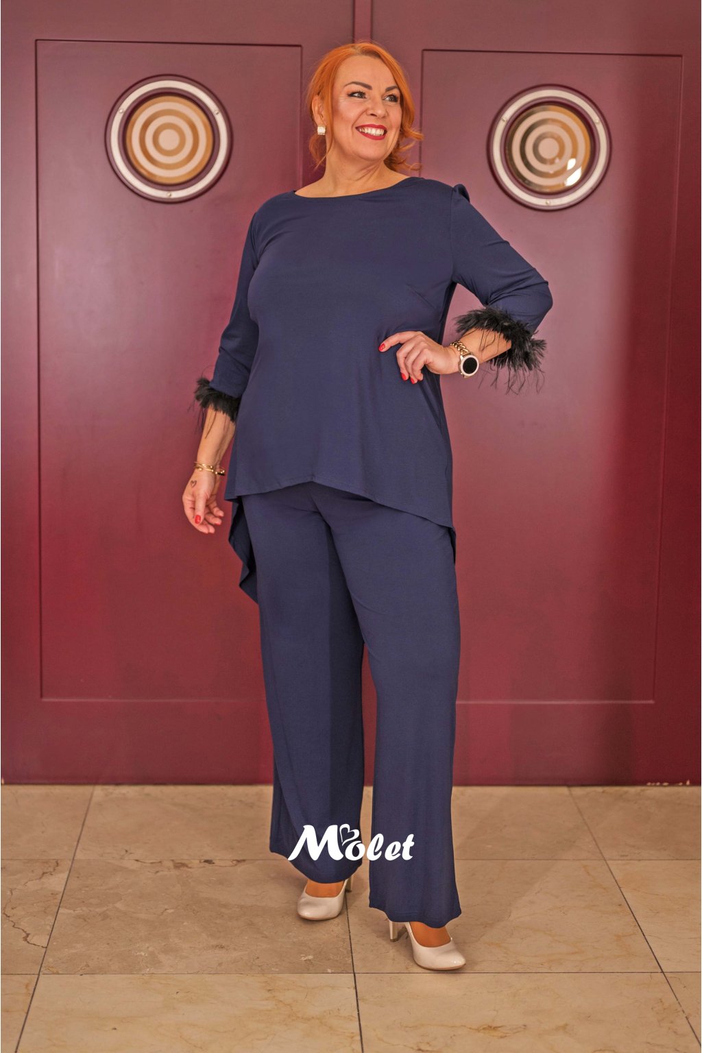 Velmi šik společenská tunika, která má asymetrický střih a na rukávech lemování z peří. Přední délku šijeme v délkách 70, 80 nebo 90 cm.