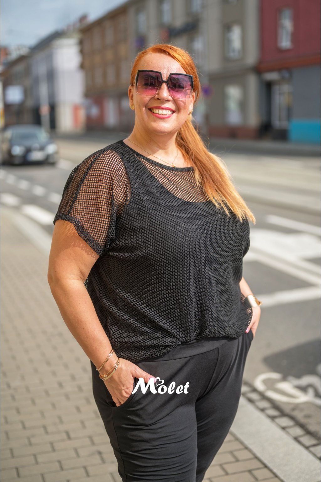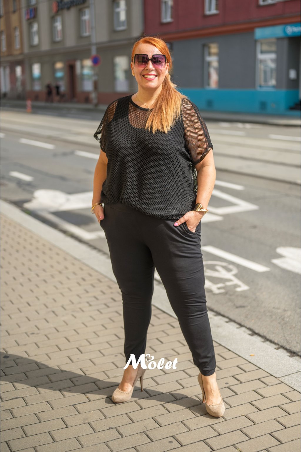 Naše MOLETKA je vysoká cca 176 cm a má na sobě konfekční velikost 50