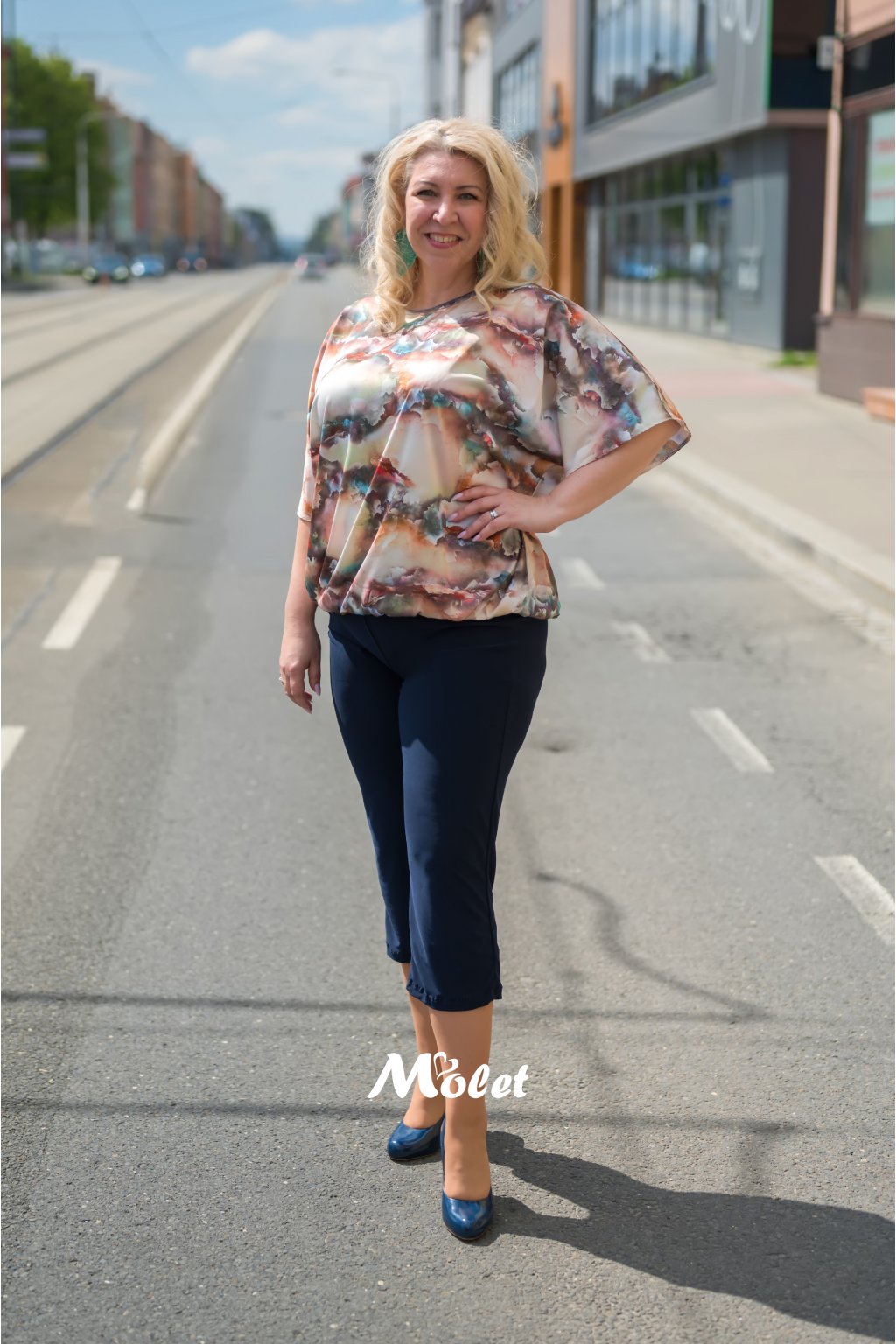 Halenka volnějšího střihu s netopýřími rukávy. Dole je zakončena gumičkou. Velmi příjemný lehký letní materiál.