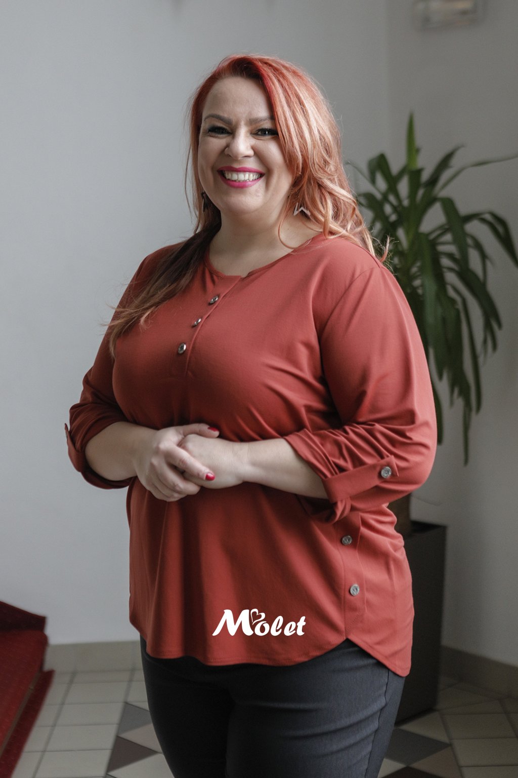 Naše plus size MOLETKA Míša je vysoká cca 174cm a má na sobě konfekční velikost 52.