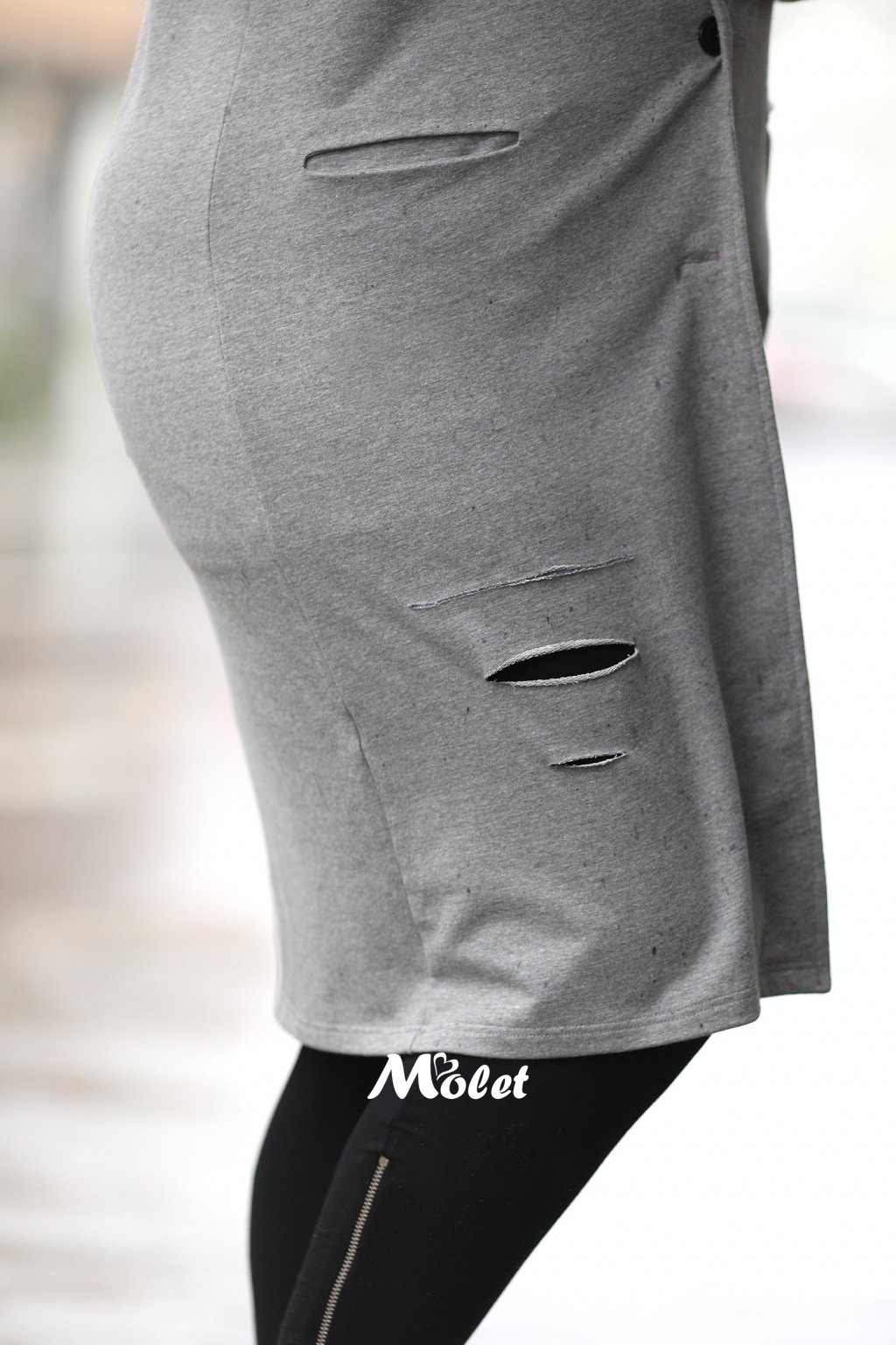 Skvělý dlouhý jednobarevný kabát bez podšívky. Chybí Vám něco k doladění Vašeho outfitu? Sáhněte tedy po tomto kabátku. Kabátek z teplákoviny má trendy díry v látce na rukávech, spodní přední části a na zádech, některé díry jsou podlepené. Skvělý přírodní materiál, pohodlné kapsy a klopy ve výstřihu. Záševky na prsou. Vhodný k vrstvení či na chladnější dny. Šijeme v délce 105 cm ve více barvách.