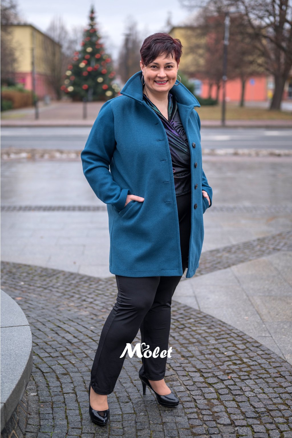 Naše MOLETKA je vysoká cca 174 cm a má na sobě konfekční velikost 50, délka kabátu na fotografii je 90 cm.