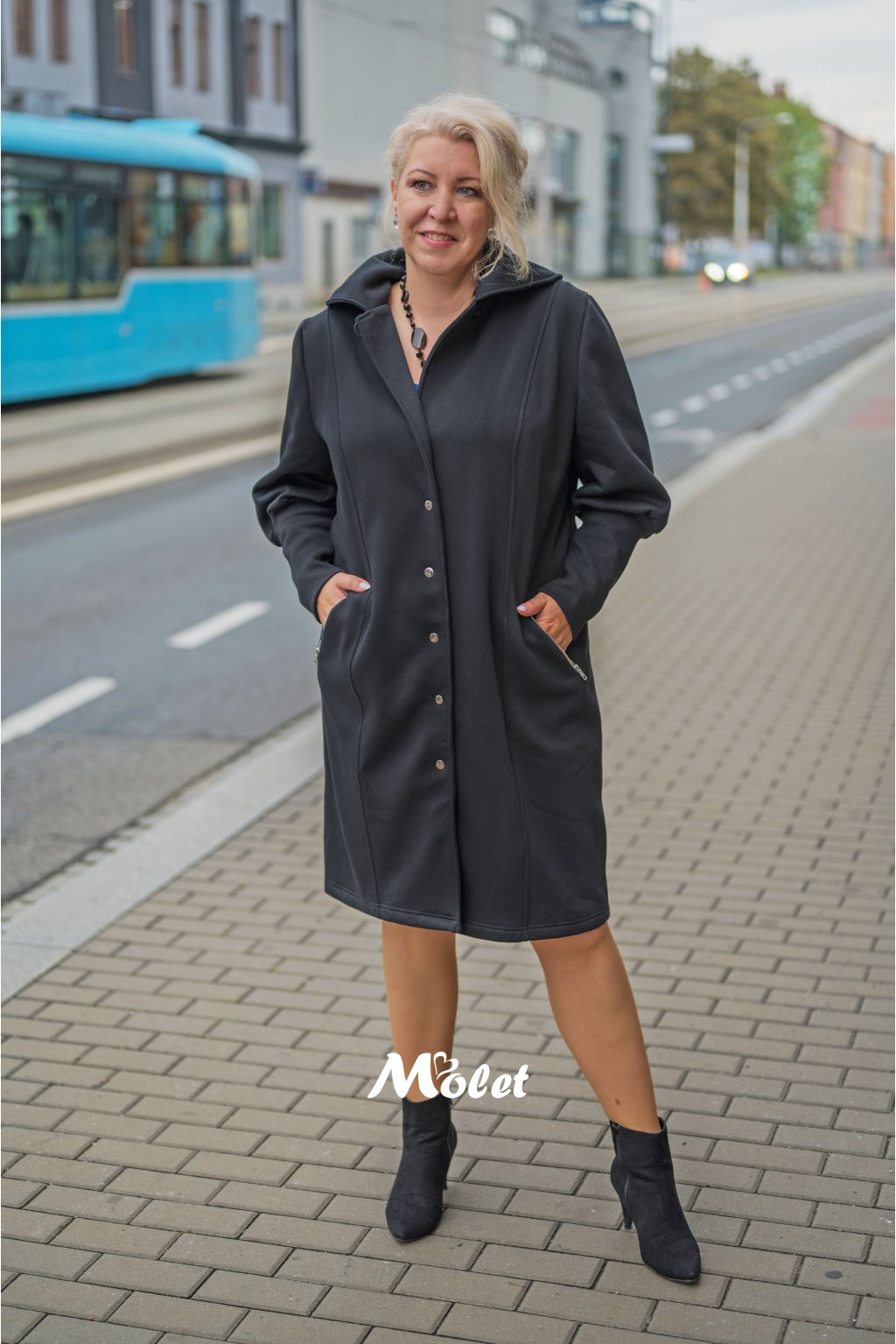 Dámský kabát z luxusní zateplené hrubé směsové vysokogramážní bavlny s polyesterem s chlupem na rubu. Má princesový střih, klopy, kulatý límec a zapínáním na cvoky. Kapsy jsou na zipy a na rukávech má velmi módní náplety.