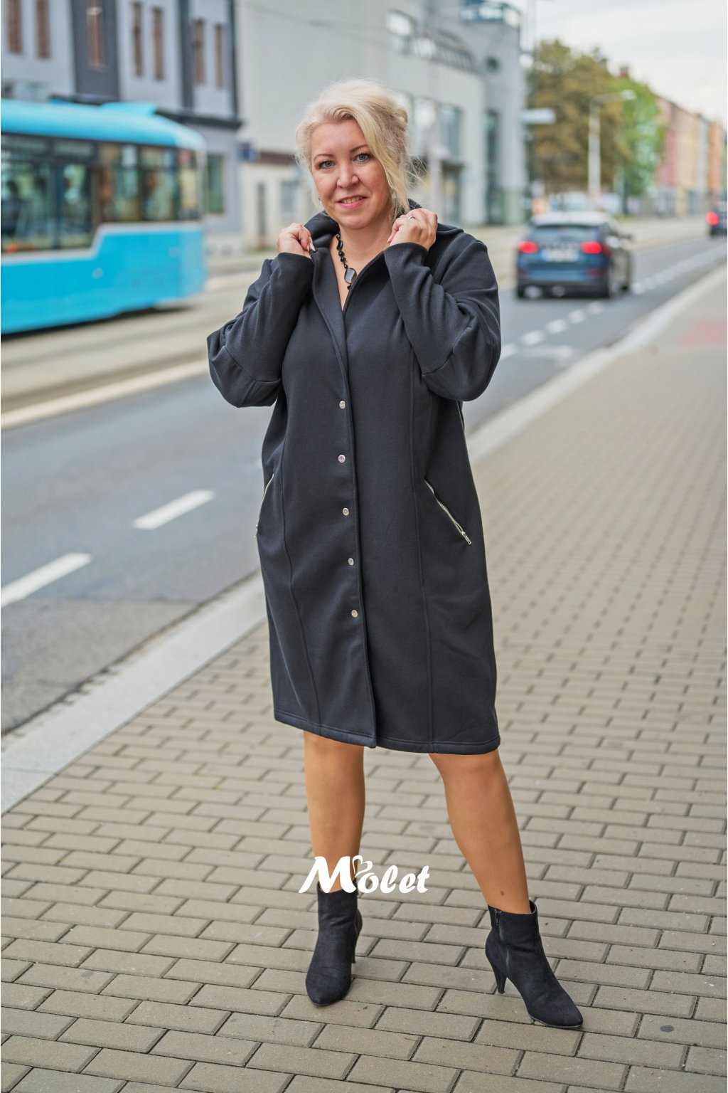 Naše MOLETKA je vysoká cca 176 cm a má na sobě konfekční velikost 52, délka 105 cm.