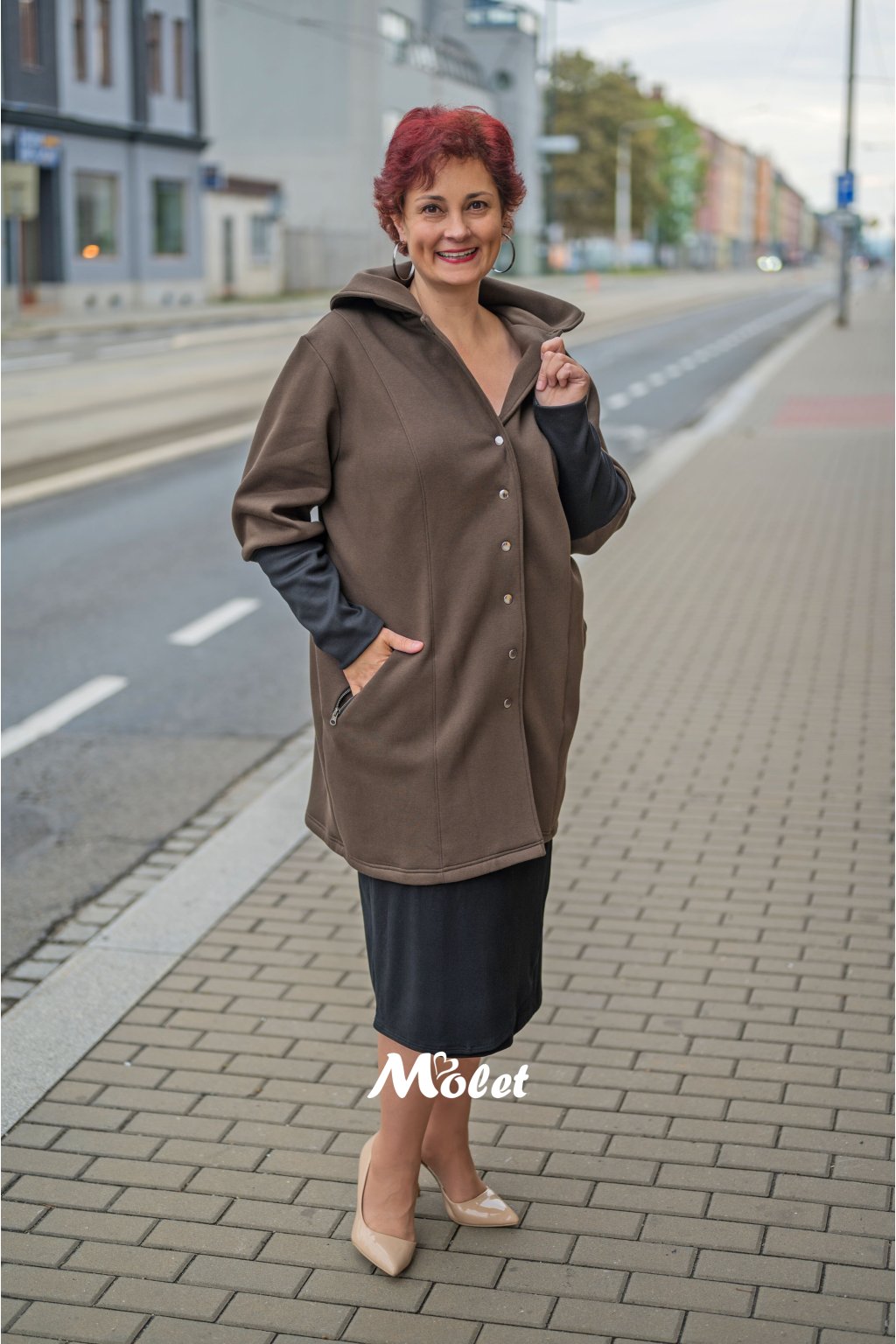 Naše MOLETKA je vysoká cca 176 cm a má na sobě konfekční velikost 52, délka 105 cm.