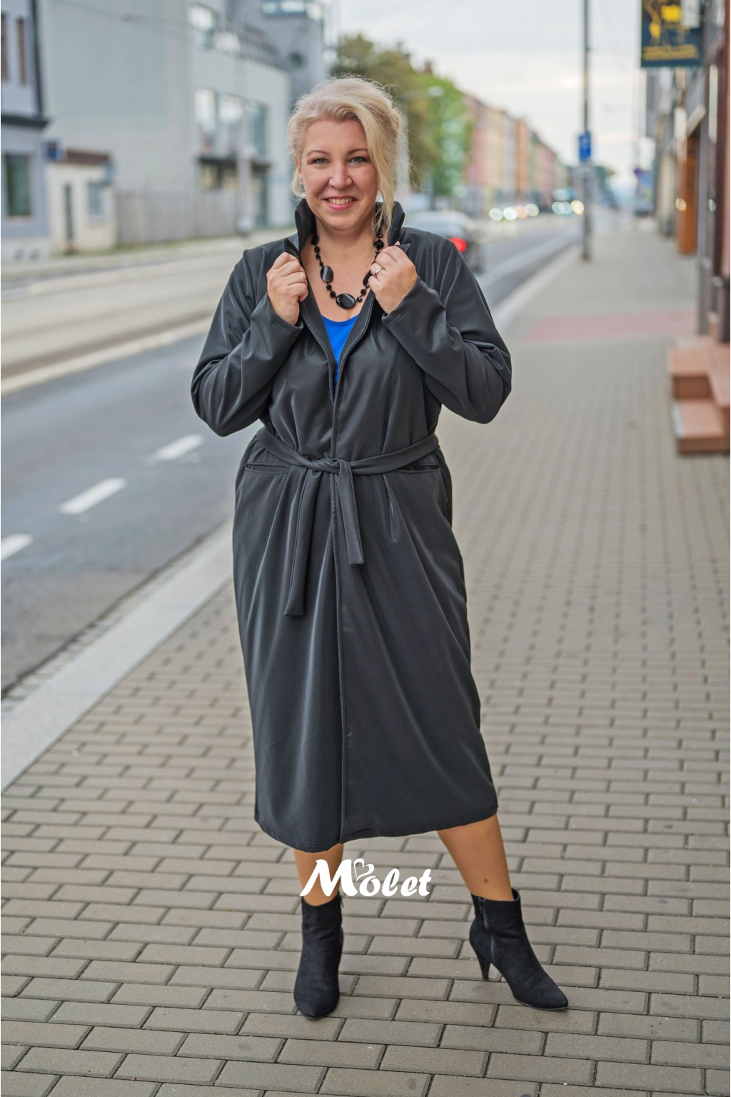 Dlouhý dámský kabát s klopami, knoflíky a páskem na zavazování. Je ušit z pružné ekokůže s jemným vzorečkem. Má kapsy a je opravdu pohodlný.