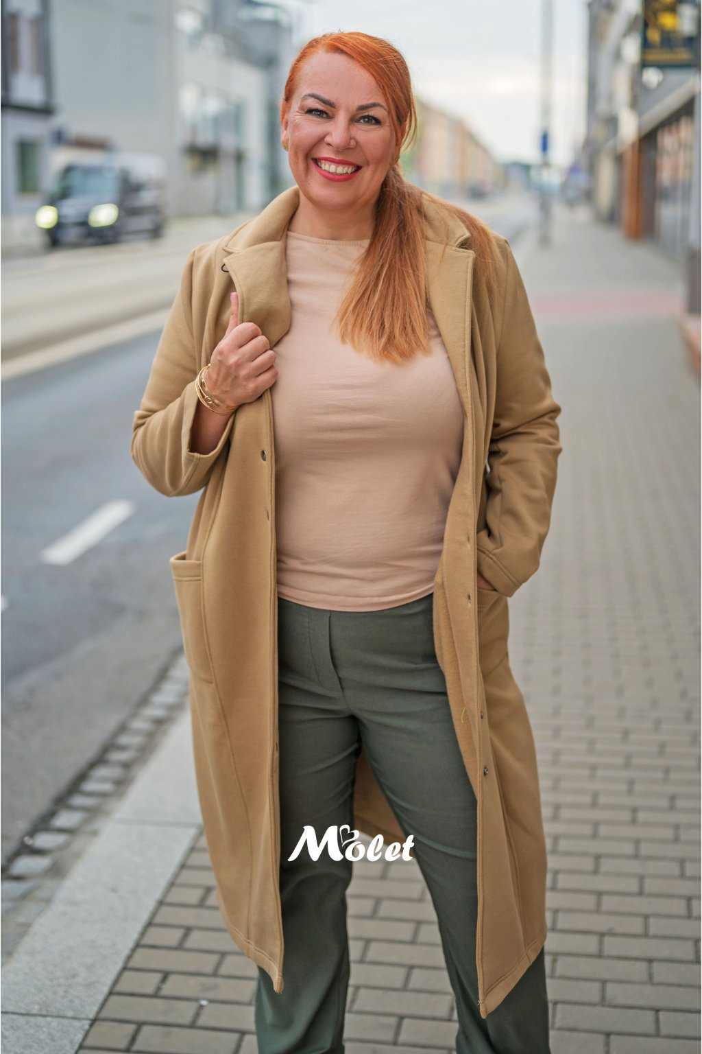 Zajímavě řešená zádová část dělá z kabátku elegantní model. Kabát má kapsy a béžovo hořčicovou barvu.