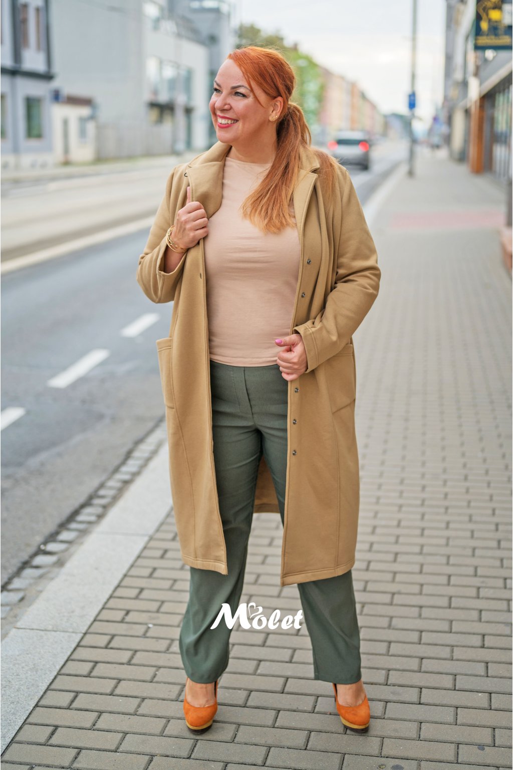 Dámský kabát z luxusní zateplené hrubé směsové vysokogramážní bavlny s polyesterem s chlupem na rubu. Má princesový střih, klopy, kulatý límec a zapínáním na cvoky.