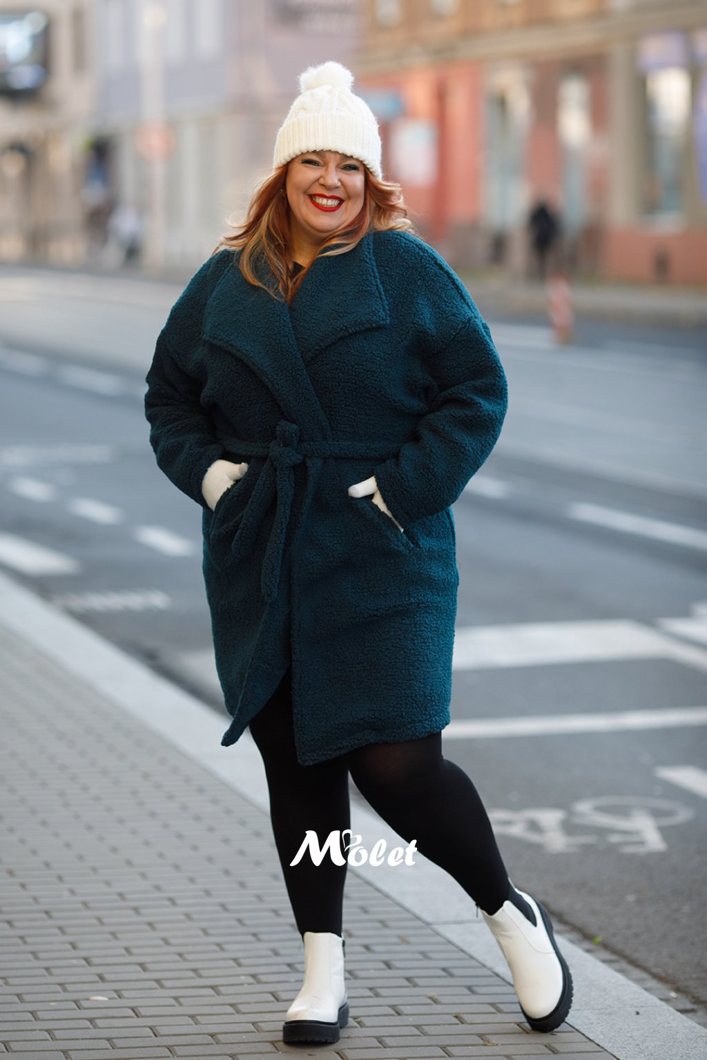 Naše plus size MOLETKA je vysoká cca 174 cm a má na sobě konfekční velikost 48.