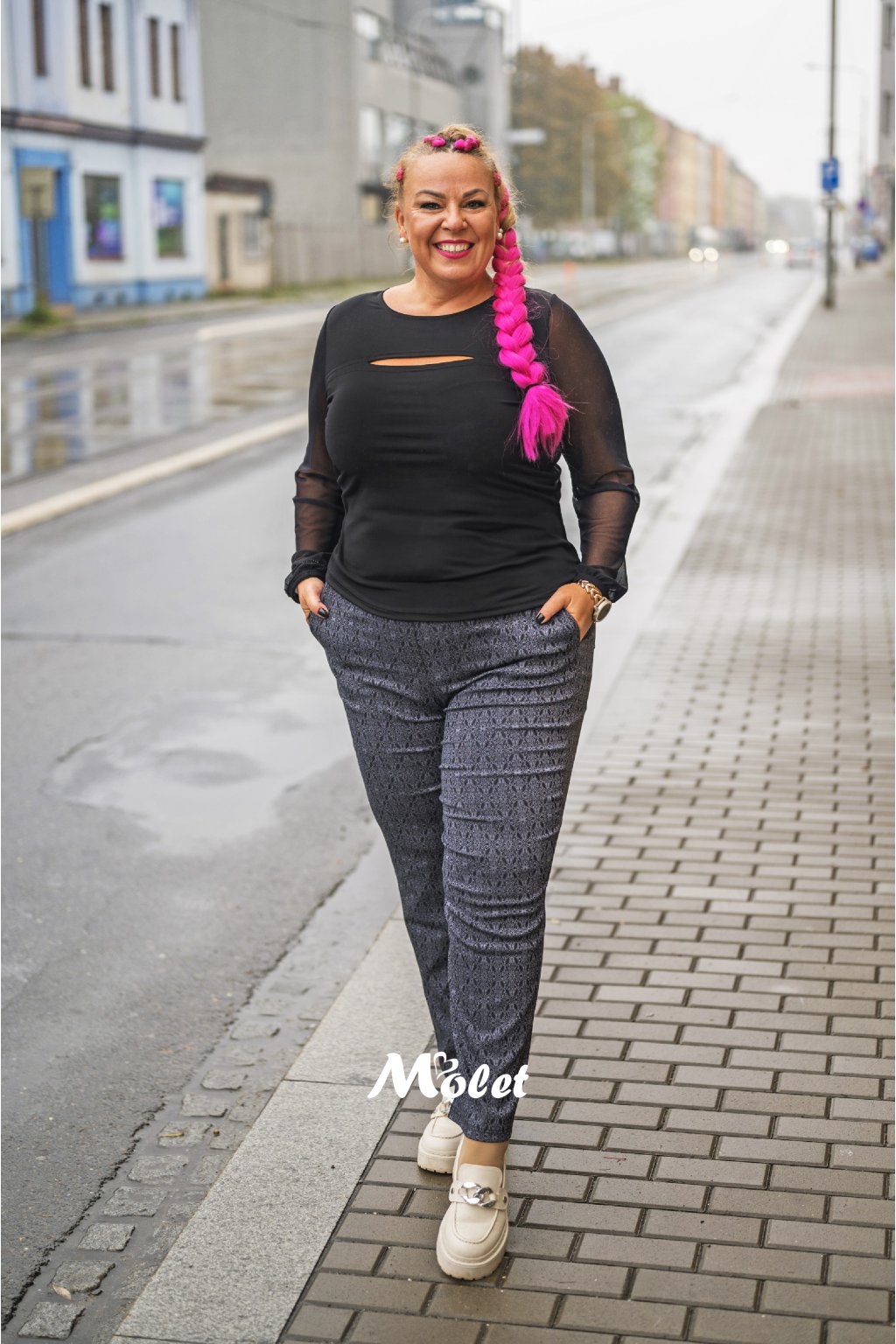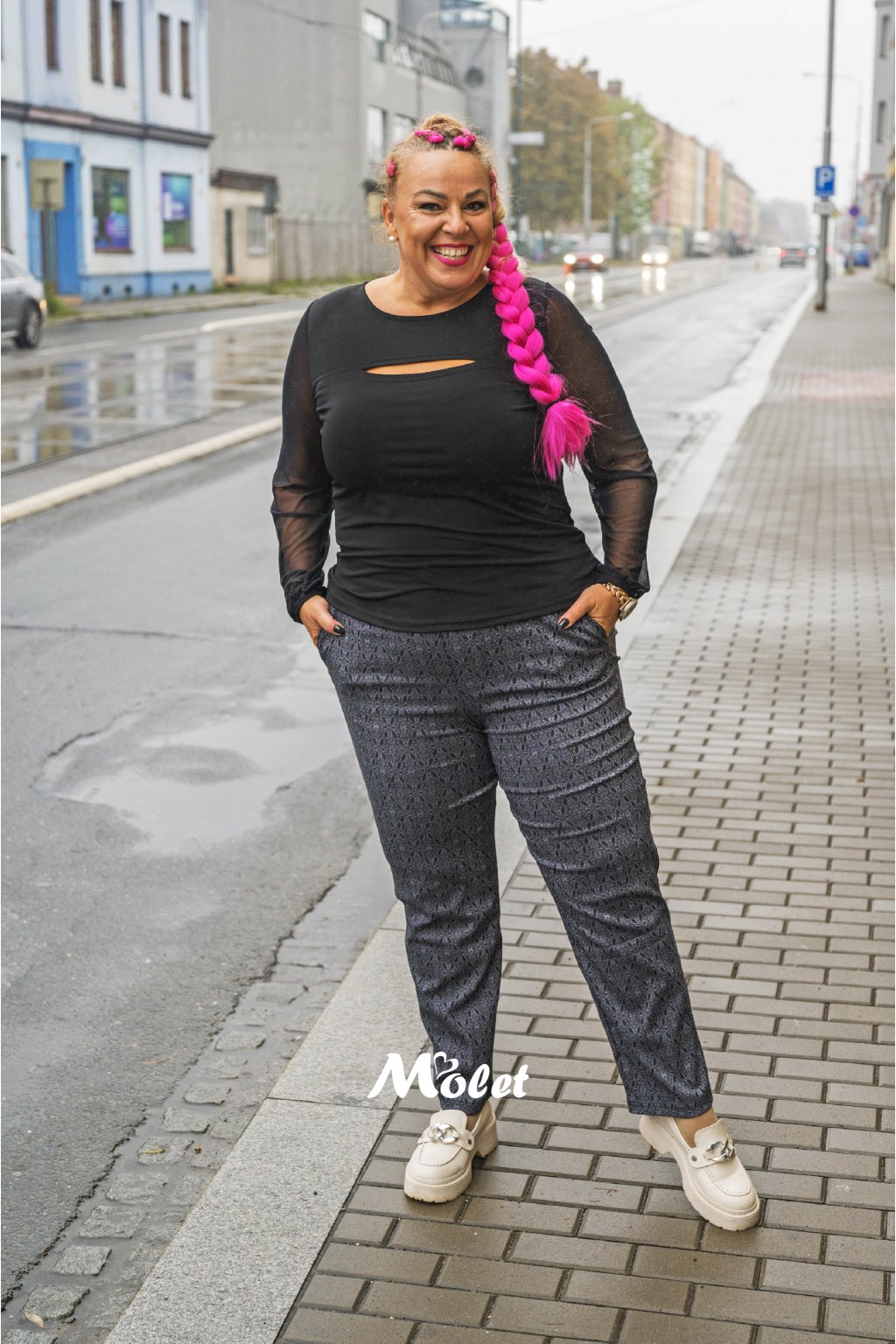 Naše plus size modelka je vysoká cca 174 cm a má na sobě konfekční velikost 50.