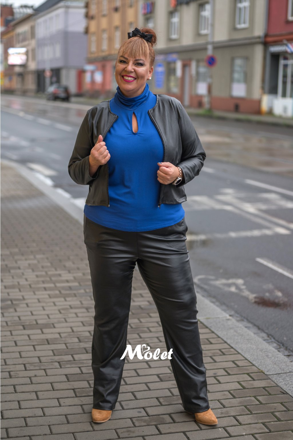 Naše MOLETKA je vysoká cca 174 cm a má na sobě konfekční velikost 52.