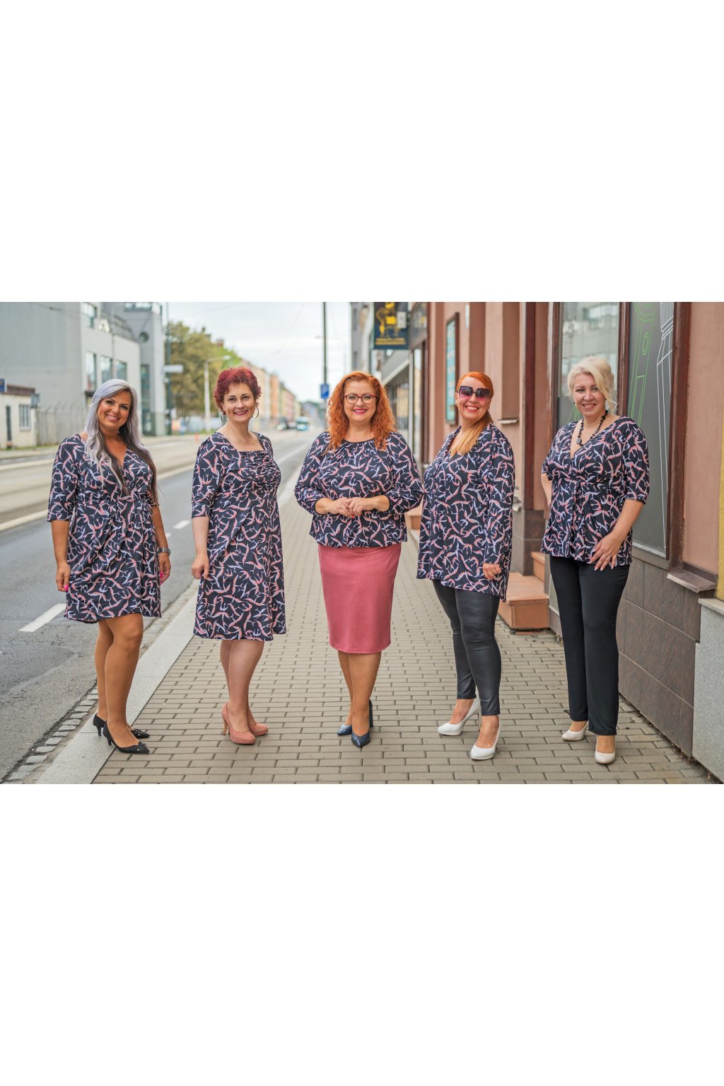 Dámské elegantní šaty nádherného designu. V pase jsou prostřižené, mají hranatý výstřih s efektními překlady na prsou a jsou ušity z velmi příjemné jemné a hladké látky, která krásně pruží. Látka je poseta růžovými ptáčky na tmavém podkladu.