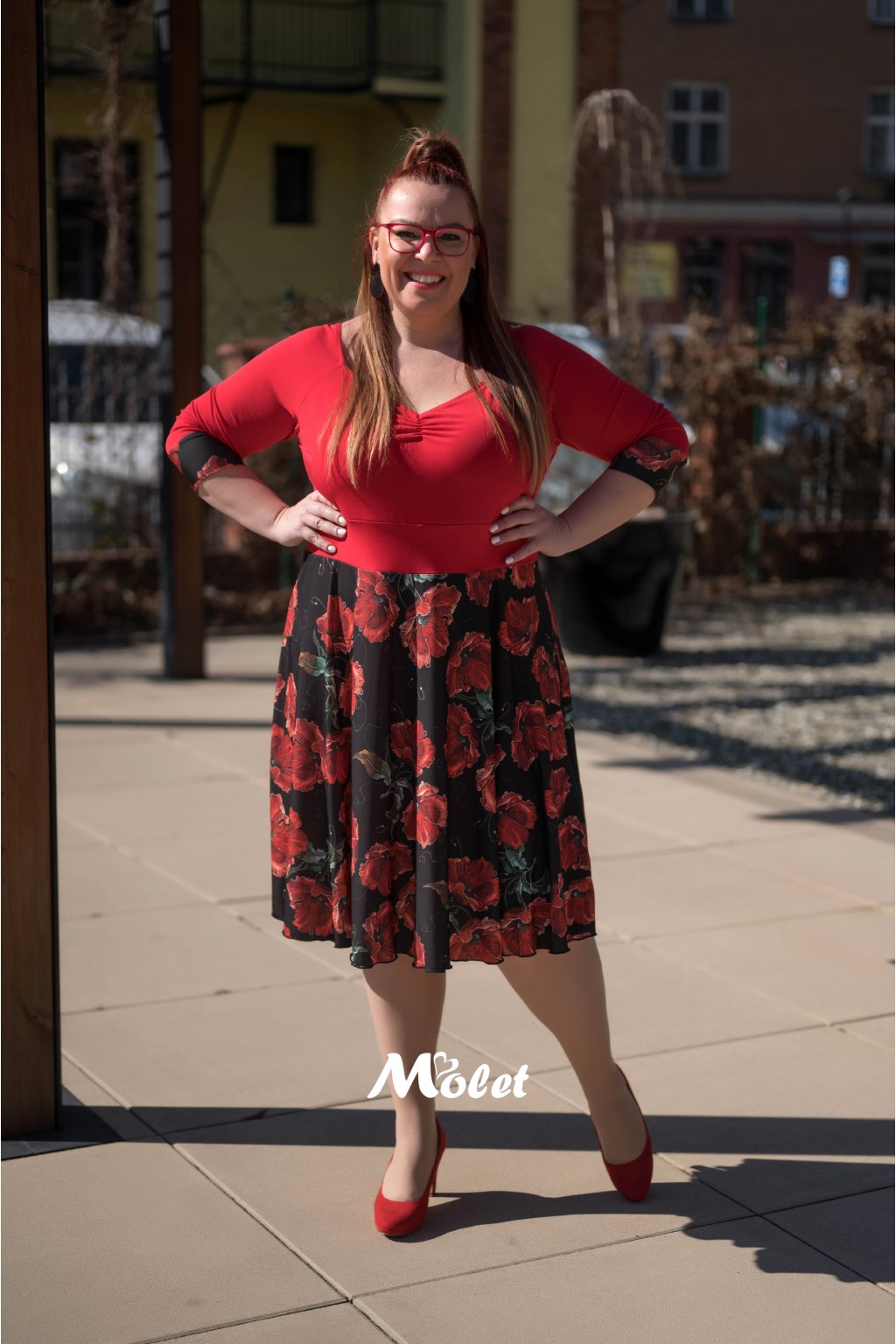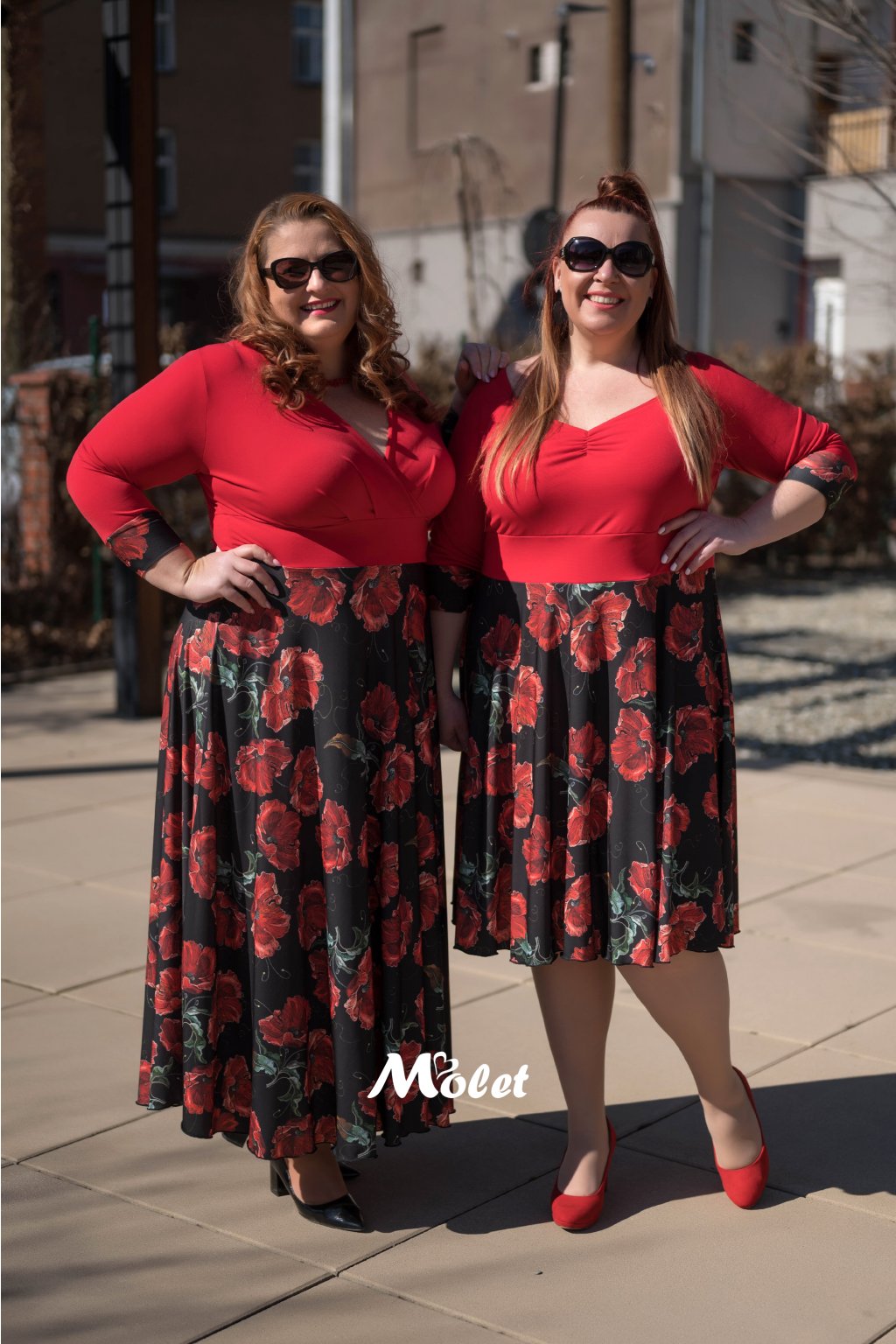 Krásné květinové šaty s áčkovou sukní. Vrch šatů má krásný hluboký výstřih, který je řasený a pod prsy je prostřižení. Šaty jsou velmi pohodlné, příjemné na tělo a mají 3/4 rukáv. Rukáv je zakočen ozdobnou manžetou. Na potisku jsou vlčí máky.