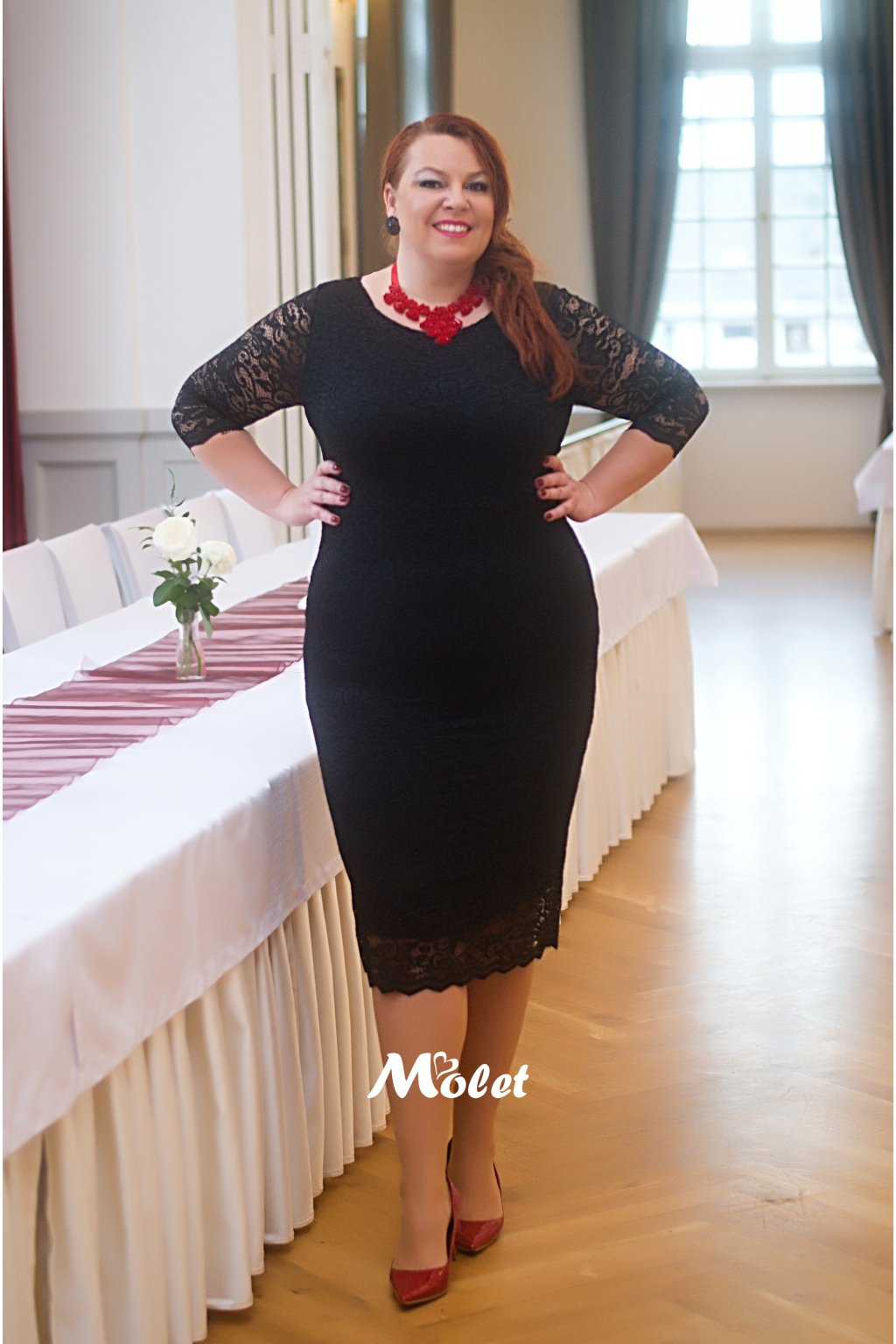 Naše MOLETKA měří 174 cm a má na sobě 50 konfekční velikost.