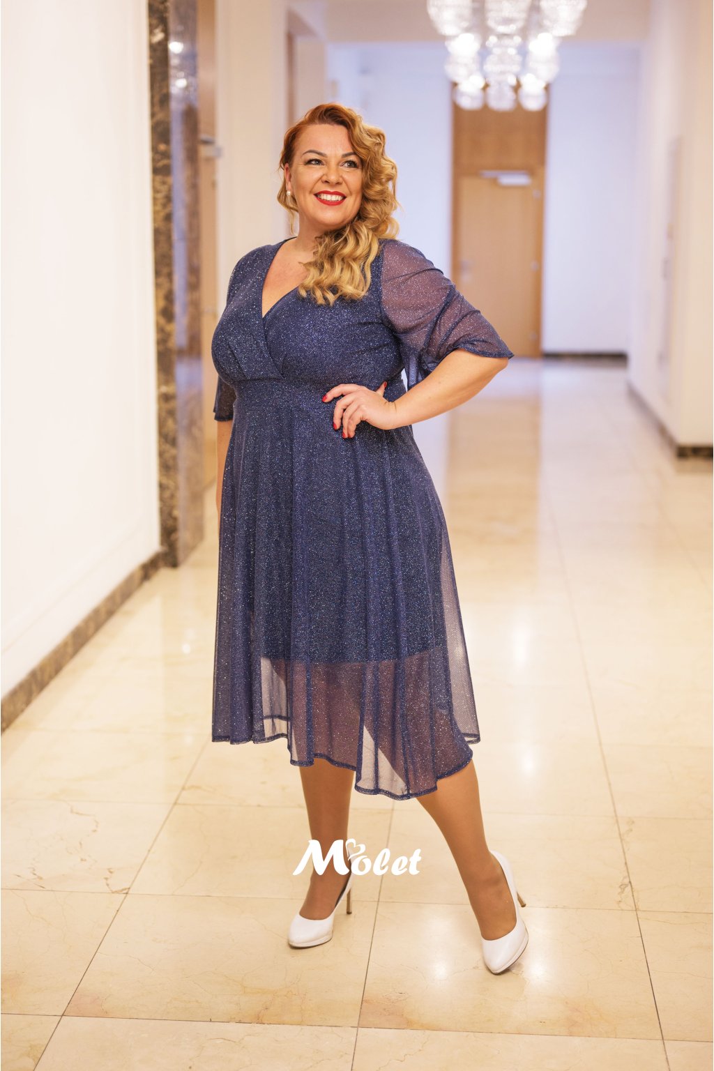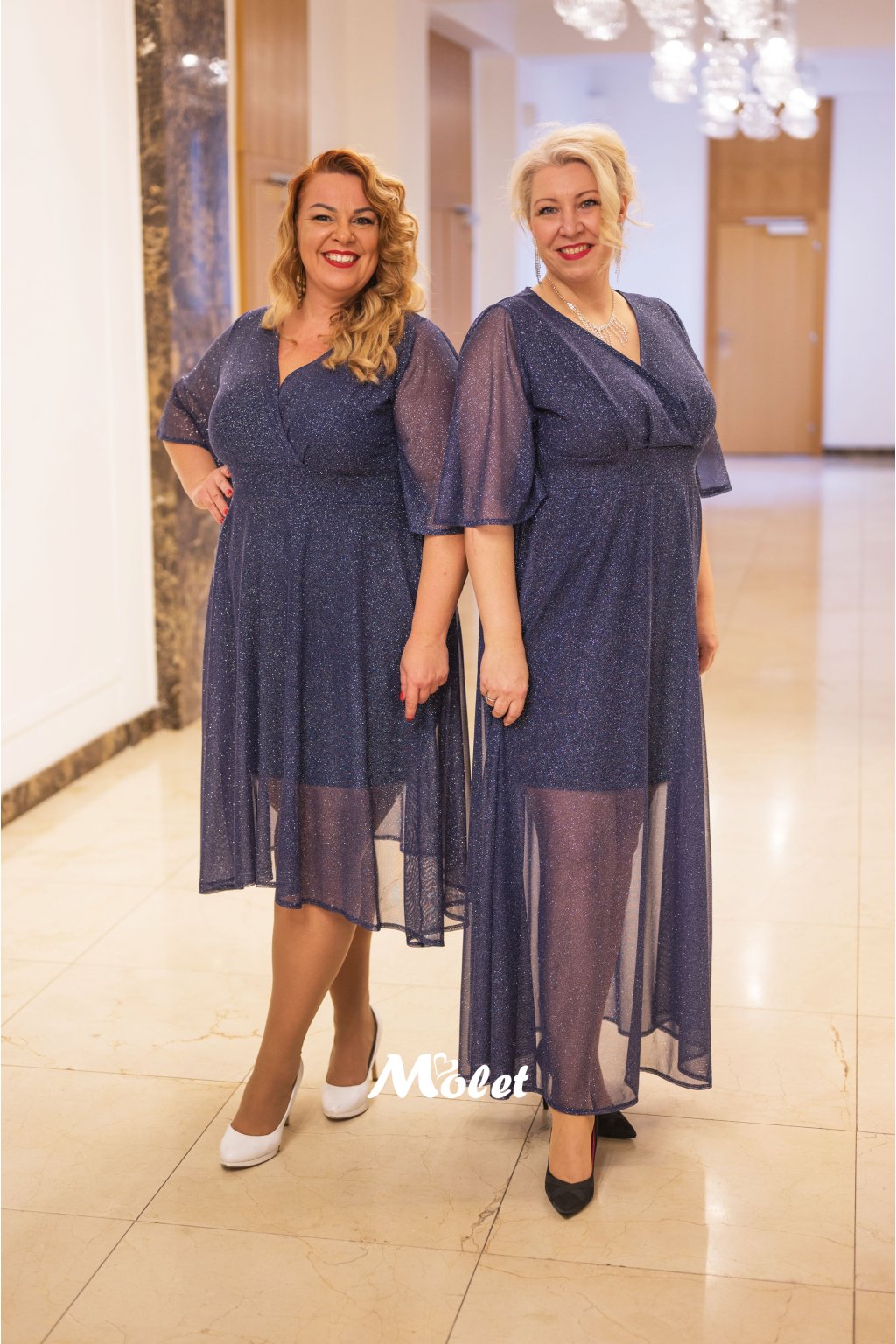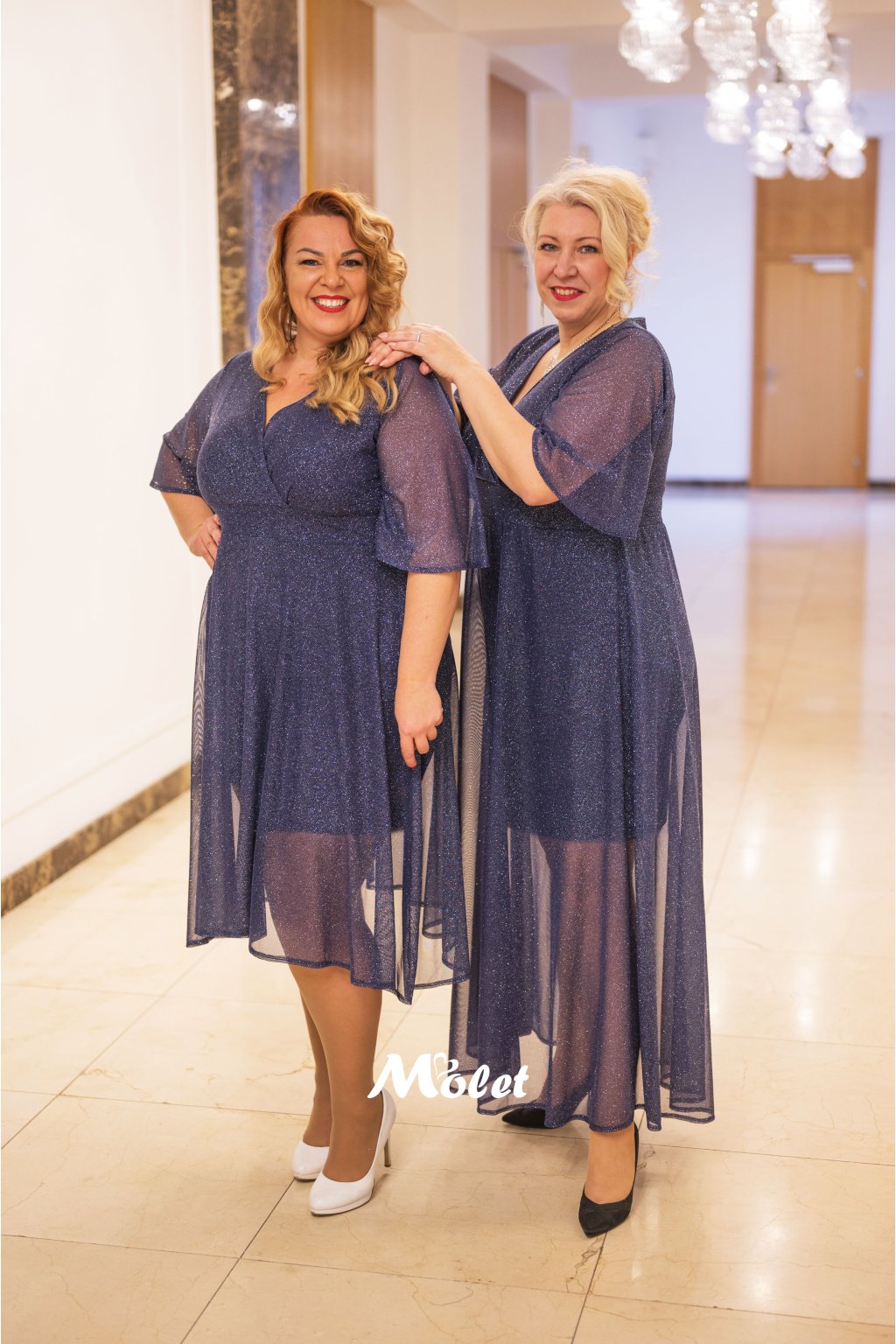Mají krásně řešený přeložený výstřih, zvonkové rukávy a áčkovou sukni. Jsou z temně modrého pružného tylu, který se třpytí a také podšívka krásně pruží.