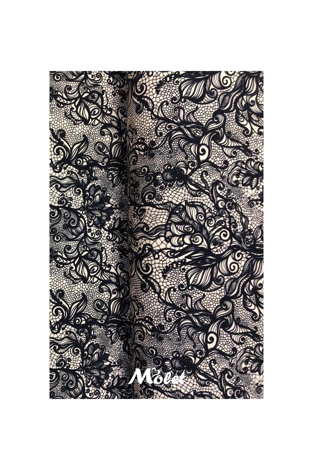 Černý digitální tisk krajky na světle béžovém podkladu.