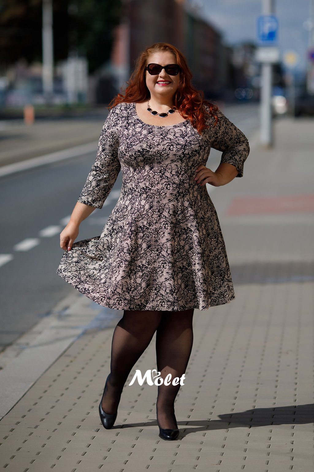 Naše plus size MOLETKA je vysoká cca 174 cm a má na sobě konfekční velikost 48 o délce 105 cm.
