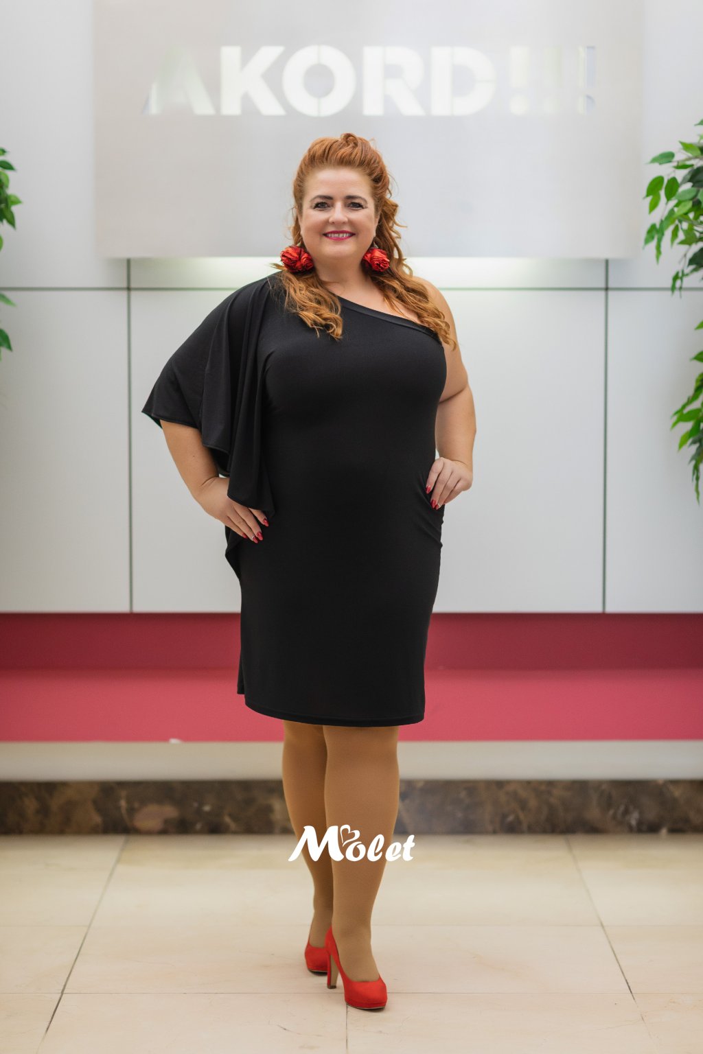Naše plus size MOLETKA je vysoká cca 174 cm a má na sobě konfekční velikost 48.