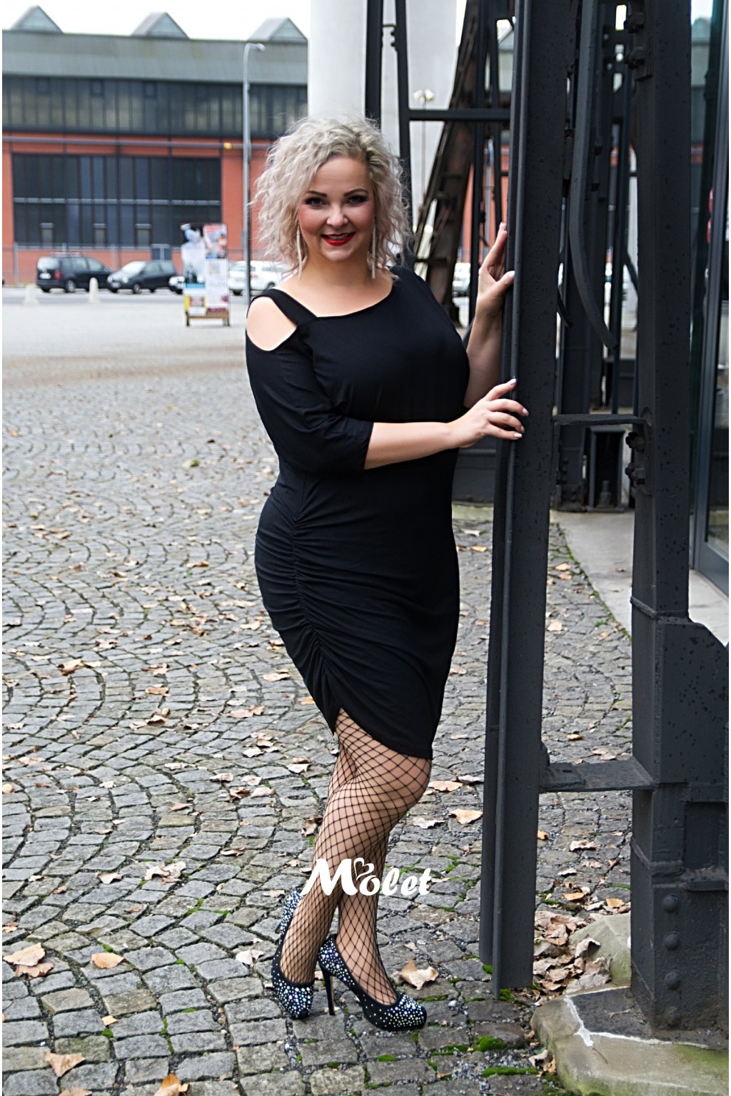 Naše plus size MOLETKA je vysoká cca 174 cm a má na sobě konfekční velikost 48 o délce 95 cm.