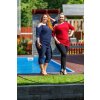94% polyester 6% elastanu, výrobce doporučuje praní na 30°.