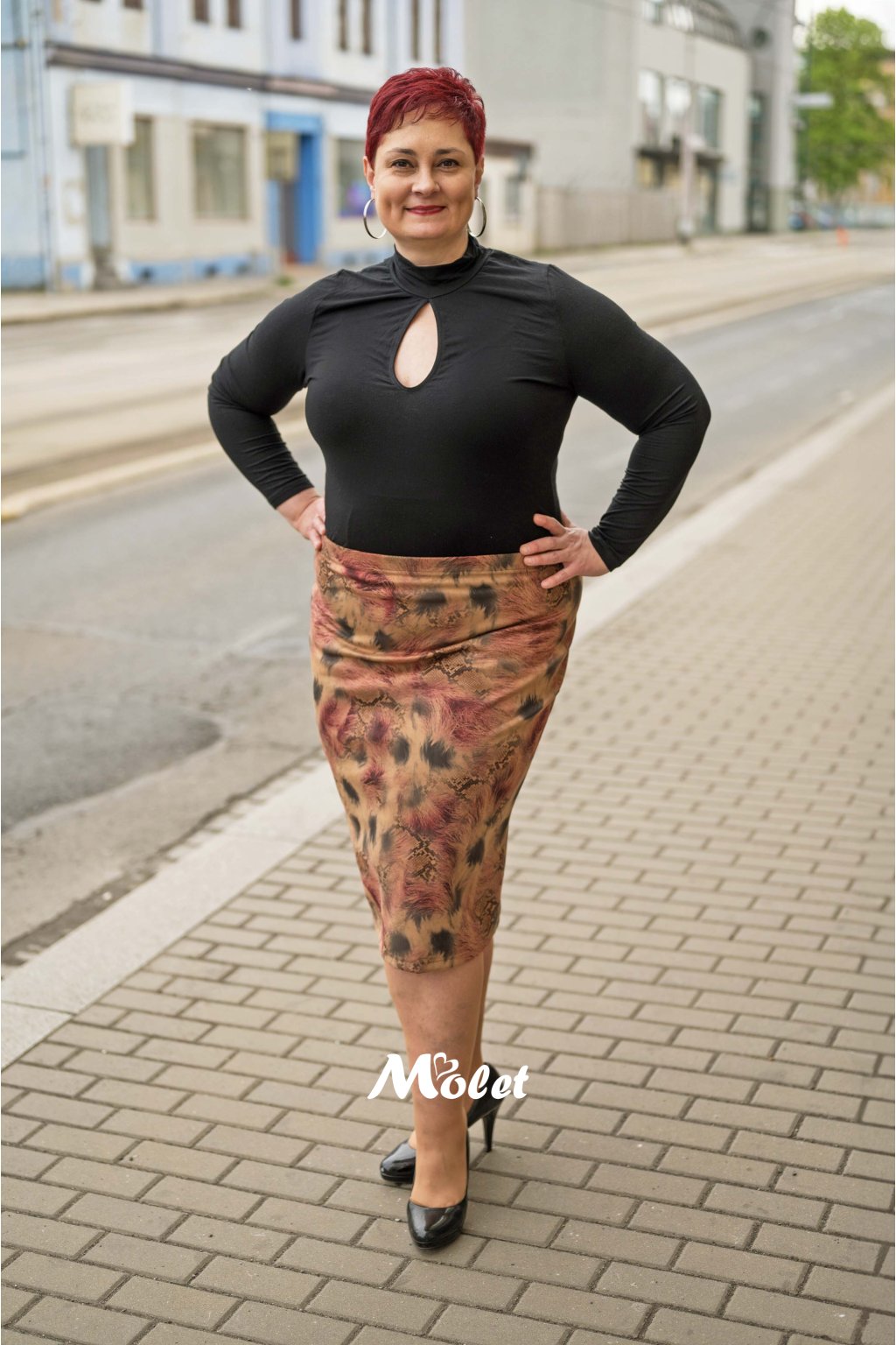 Velmi pohodlná, krátká sukně se vzorem v semišovém vzhledu. V pase je sukně na gumu. Materiál je pružný, přitom pevný a tím krásně kryje plnoštíhlé křivky. Velmi pohodlný a krásný elegantní model. Materiál je velice příjemný a pružný. Látka připomínající semiš.