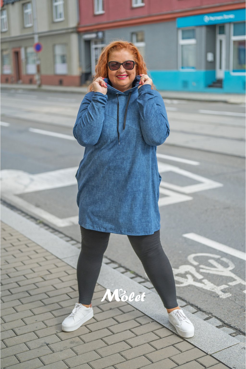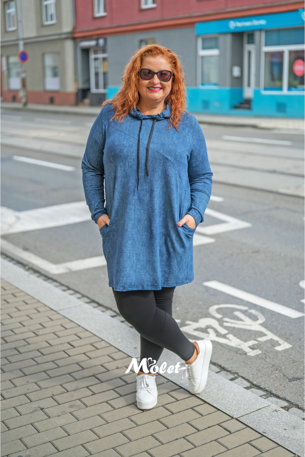 Naše plus size Moletka má cca 174 cm a má na sobě šaty s velikostí 52 cm o délce 95 cm.