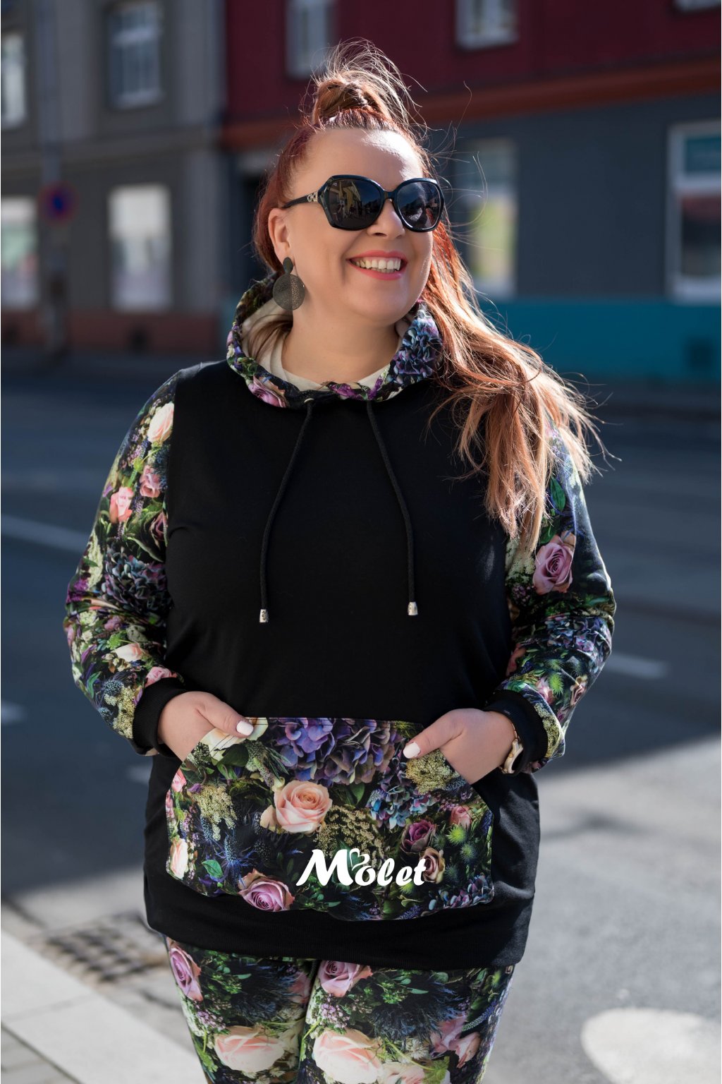 Sportovní, pohodlná mikina z černé teplákoviny doplněna bavlněnými prvky. Mikča má dlouhý rukáv, je šitá v rovnějším střihu a má klokánkovou přední kapsu a kapuci. Příjemný materiál s elastanem.