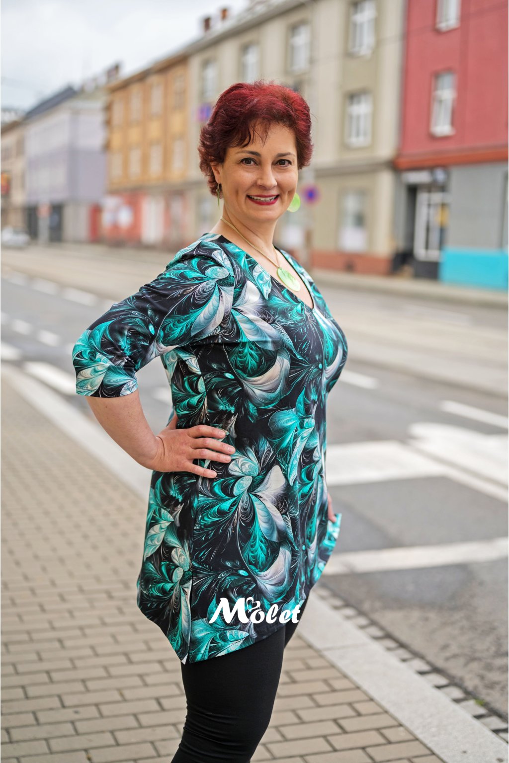 Zeštíhlující model tuniky s 3/4 rukávem. Tunika je šitá do áčka a krásně zalichotí Vaší postavě. Příjemný bavlněný materiál s elastanem zajistí pohodlí. Má zajímavý potisk. Nemá zip. Trendy halenka s efektními rozparky na bocích .