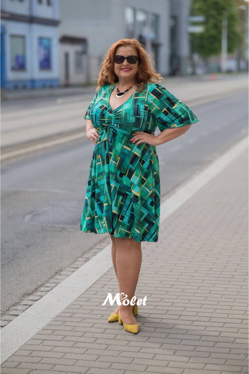 Naše plus size MOLETKA je vysoká cca 162 cm a má na sobě konfekční velikost 50 v délce 105 cm.