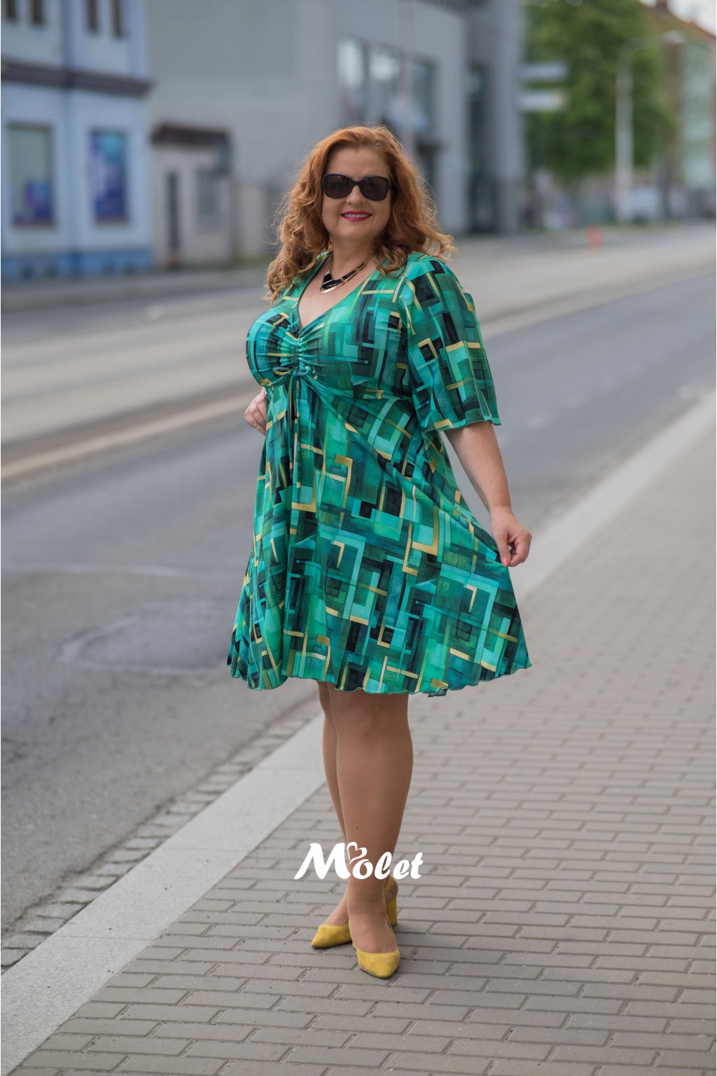 Skvělé zeštíhlující šaty, které budou lichotit Vaší postavě. Šaty lichotivé pro plnoštíhlé s geometrickým vzorem a zvonkovým rukávem.