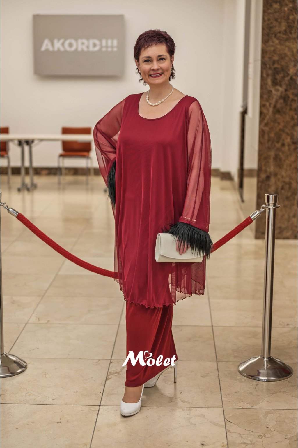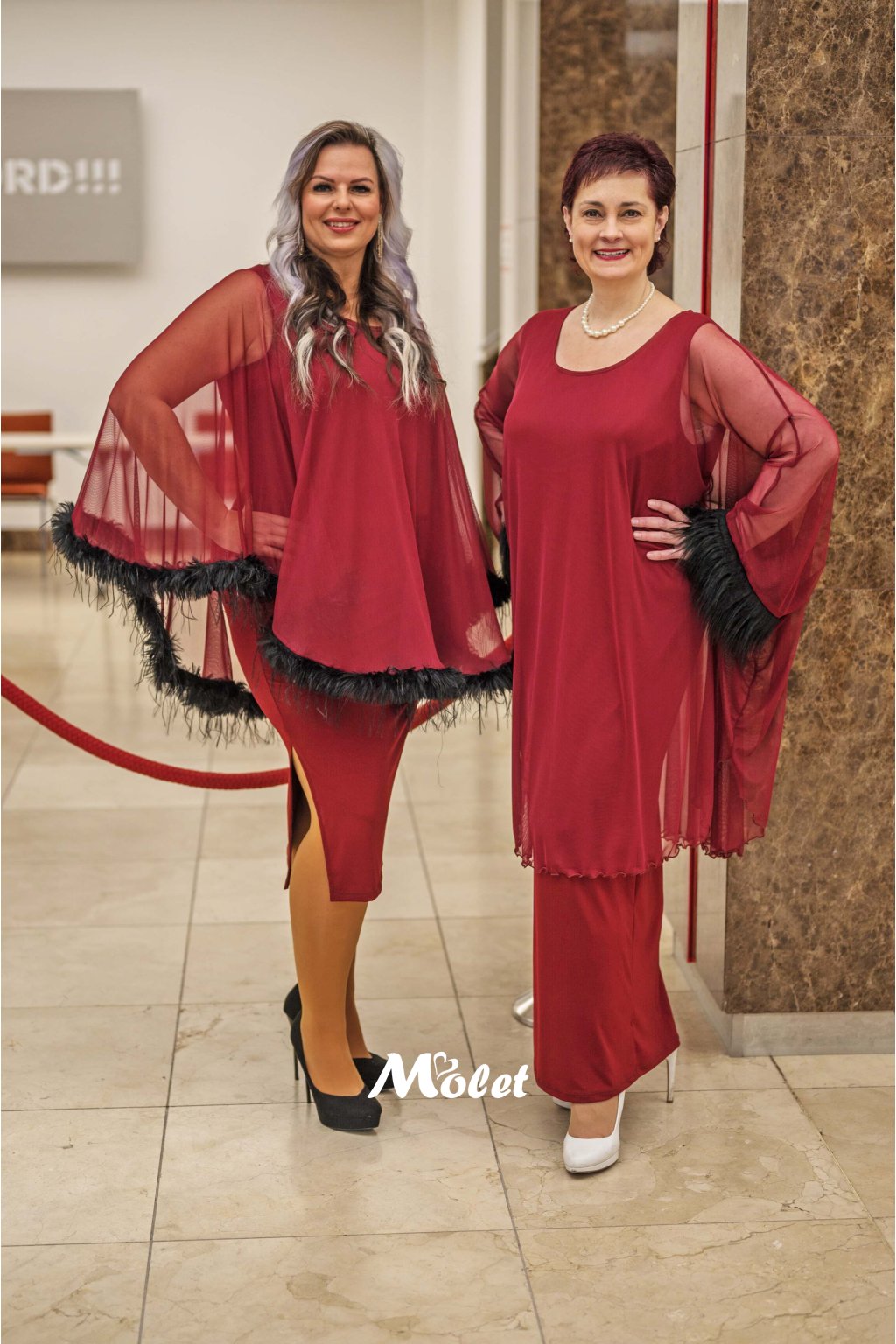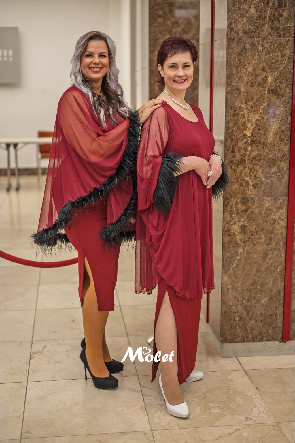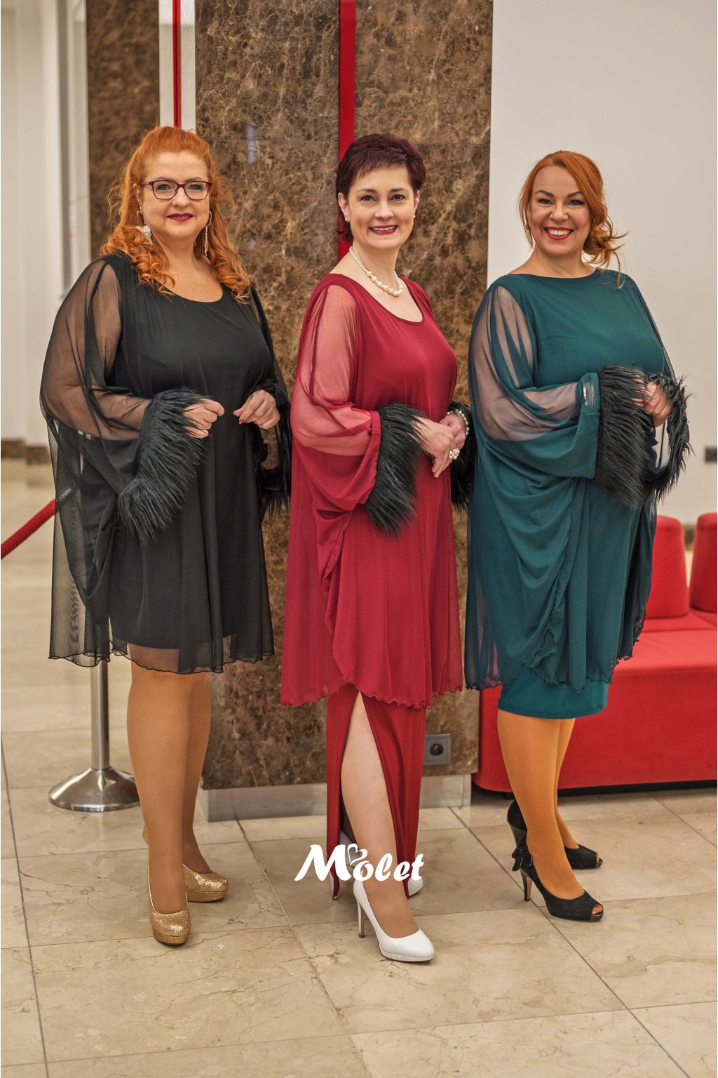 Dámské elegantní společenské šaty. Jsou vrstvené. Vrchní vrstva má kimonový volný střih z lehounké látky, kdy na rukávech je zakončení olemováno peříčky. Spodní vrstva je rovného střihu z pružného materiálu tón v tónu. Dlouhé šaty mají efektní rozparek. Šijeme v barvách černá, vínová a tmavě zelená.
