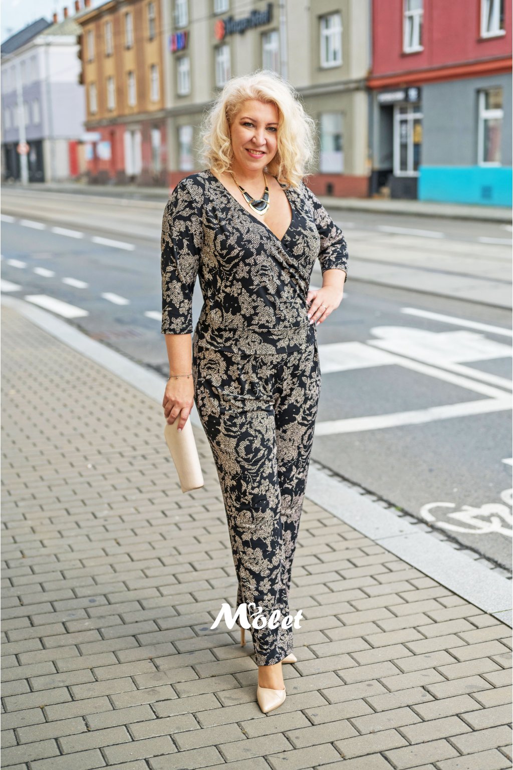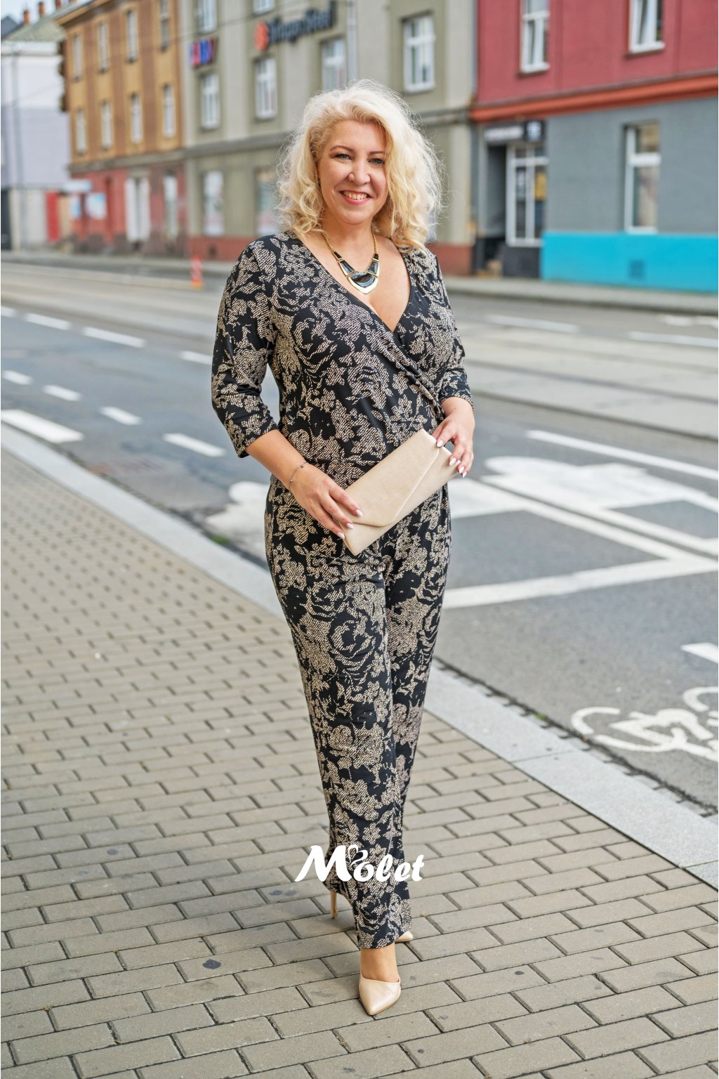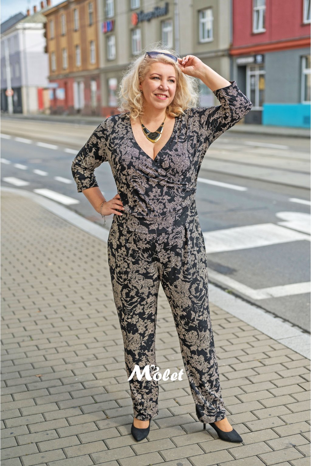 Dámský overal představuje originální alternativu oblékání.Náš overal je z úžasně pružné látky, nemá zip a má všité kapsy. Na Prsou se kříží a v pase je prostřižen. Nohavice jsou rovnějšího střihu, rukáv je 3/4. Běžový vzoreček na černém podkladu dodává overalu eleganci. Krásný společenský kousek pro plnoštíhlé.