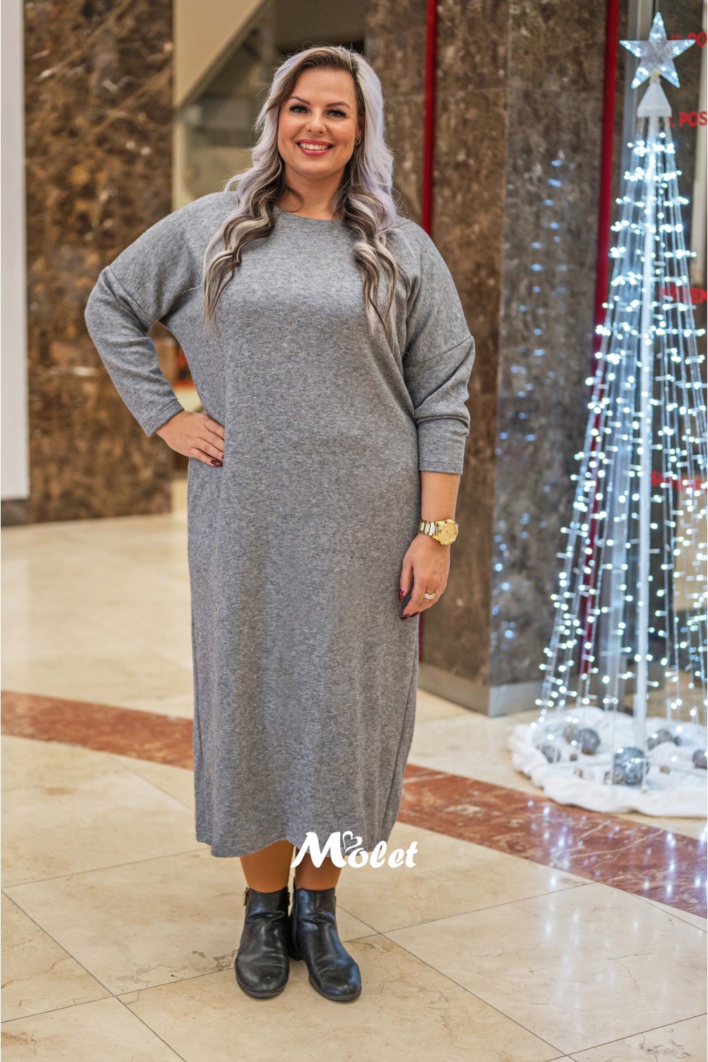 Naše plus size MOLETKA je vysoká cca 178 cm a má na sobě konfekční velikost 50/135