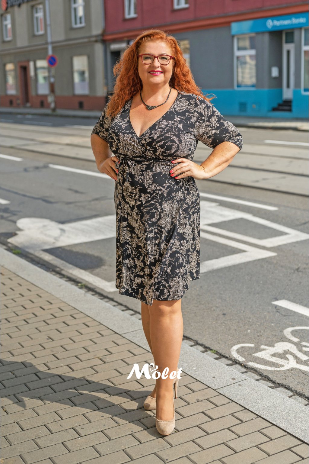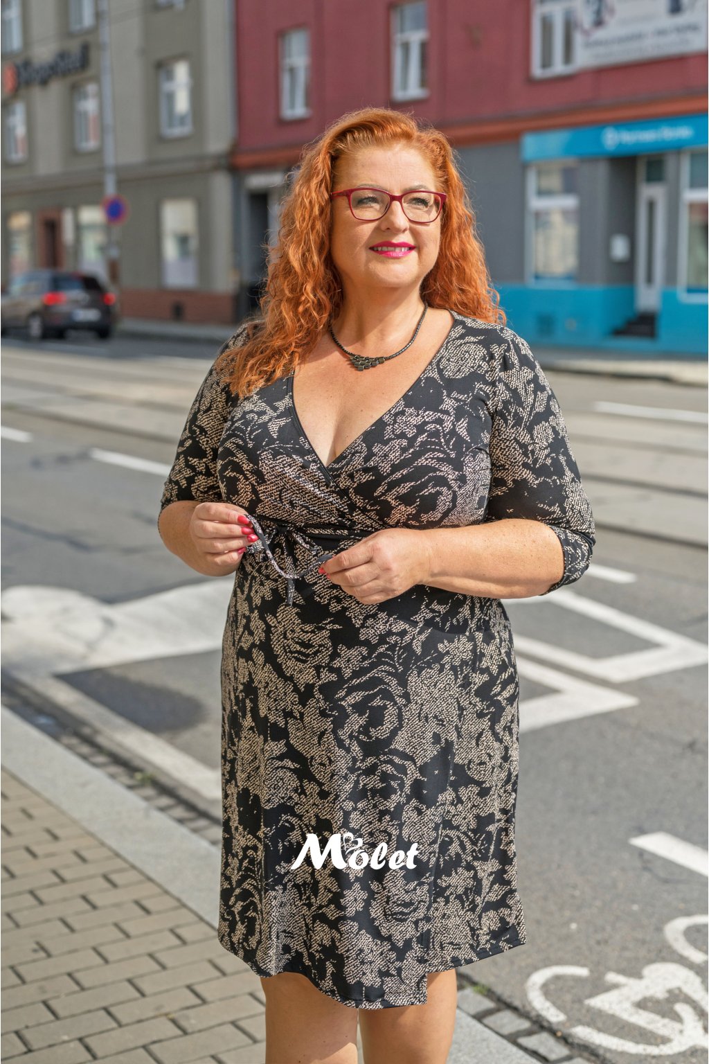 Naše plus size Moletka má cca 174 cm a na sobě má 48 konfekční velikost o délce 105 cm.