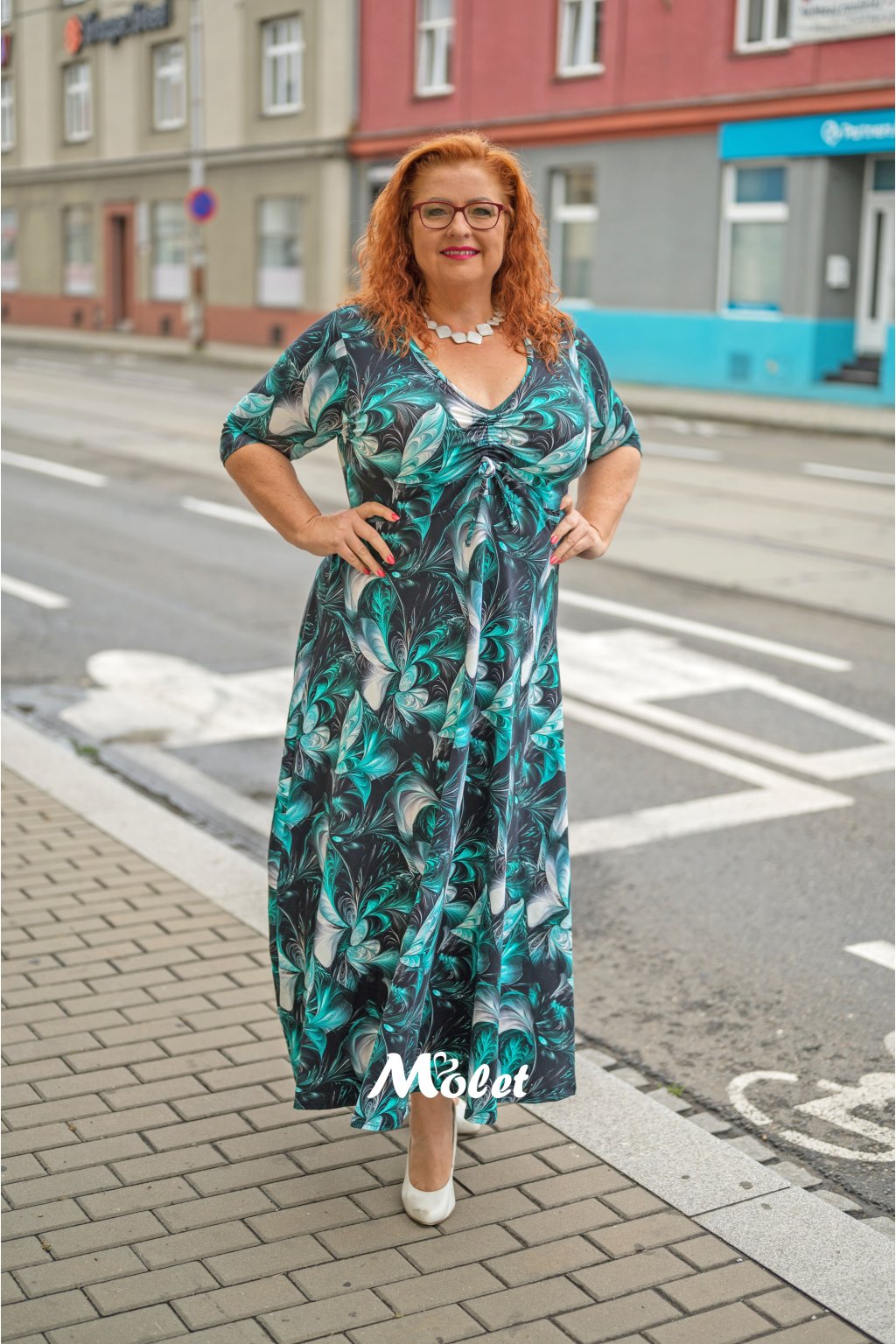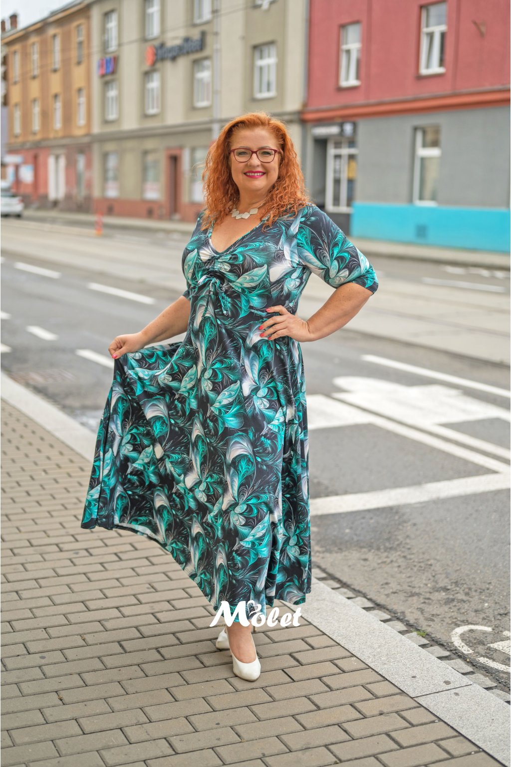 Skvělé zeštíhlující šaty, které budou lichotit Vaší postavě. Hlubší výstřih na řasení, které má šňůrku v tunýlkách. Pod prsy je prostřižení. Spodní díl má kolovou sukni. Netradiční střih, který každé ženě zalichotí. Šaty nemají zip a nemačkají se. Krásný potisk na příjemné, bavlněné látce.