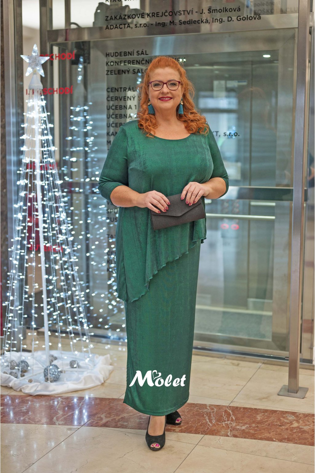 Krásné dlouhé šaty s rovnou sukní. Vrch šatů má krásný efekt 2 v 1, který působí jako halena asymetrického střihu a úzká sukně, díky tomuto střihu prodlužuje postavu. Šaty jsou velmi pohodlné, příjemné na tělo a mají 3/4 rukáv. Látka je tmavě zelená s kovovým nádechem.