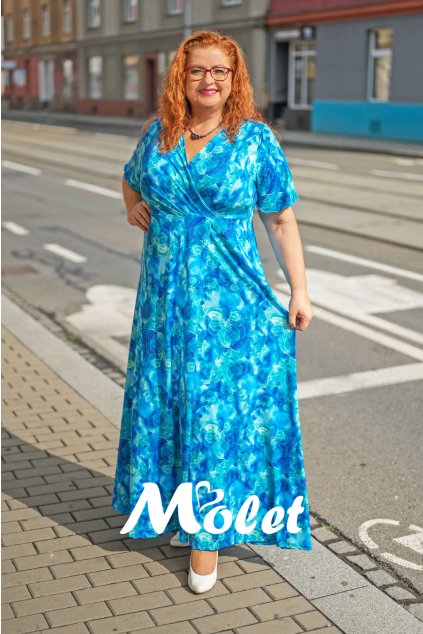 Naše MOLETKA je vysoká cca 170 cm a má na sobě konfekční velikost 50, délka jejich šatů je 145 cm.