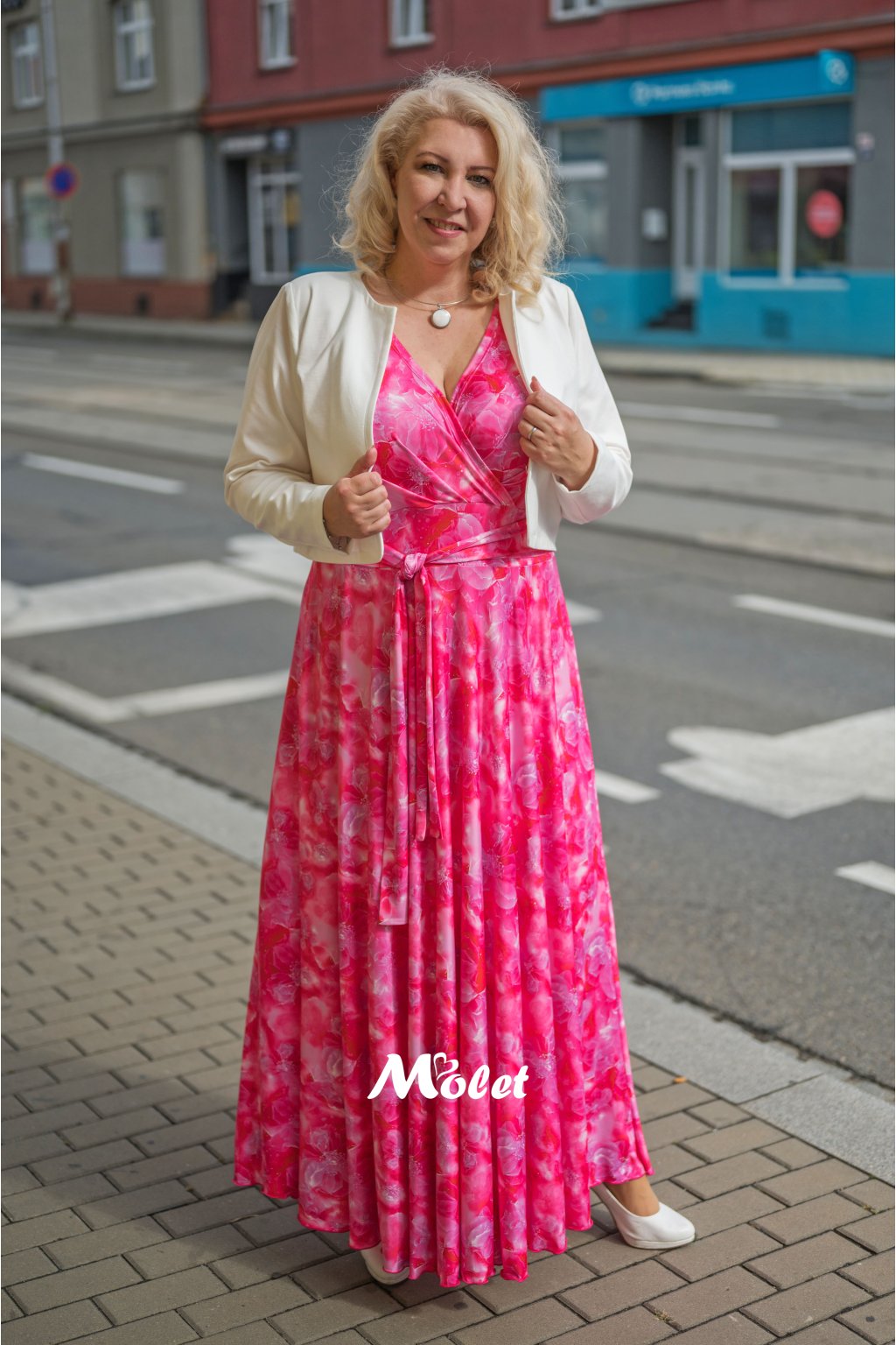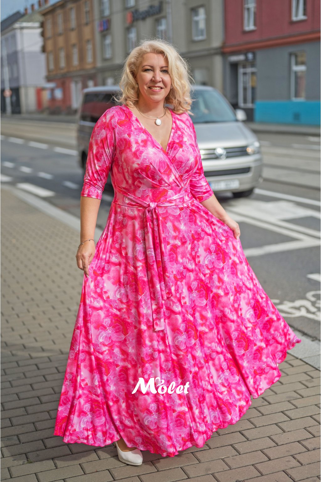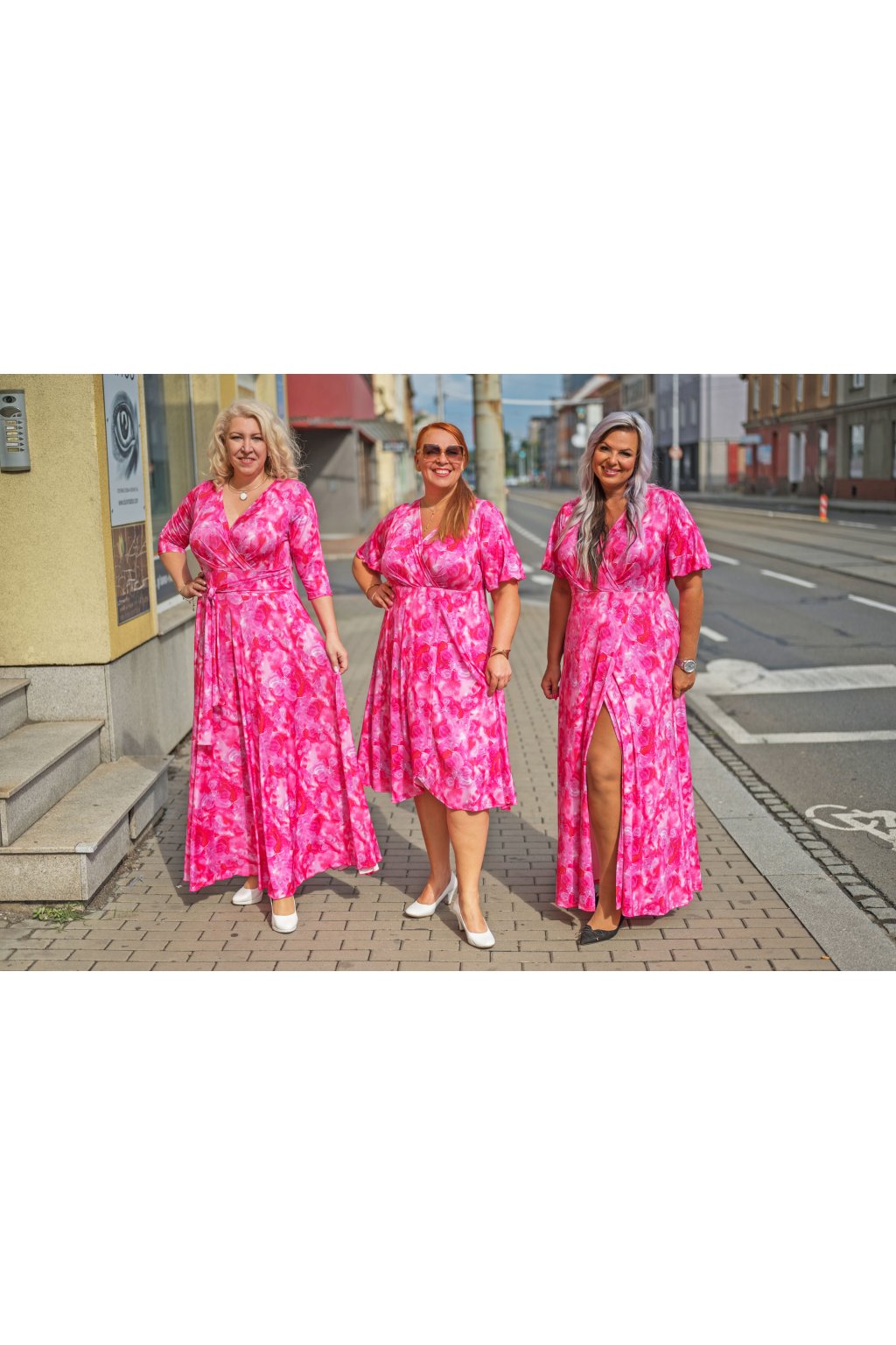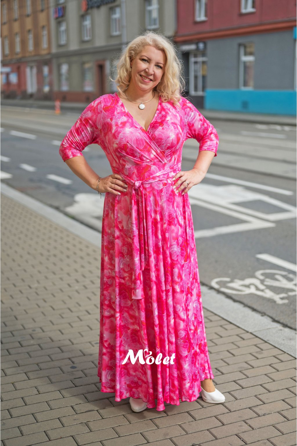 Krásné maxi šaty se středovým pásem a ozdobnou vázačkou. Vrchní díl je s hlubokým přeloženým výstřihem, který se kříží na prsou. V pase jsou prostřižené se středovým pásem a mají 3/4 rukáv. Sukně je šitá do áčka . Šaty nemají zip, nemačkají se a jsou pružné.