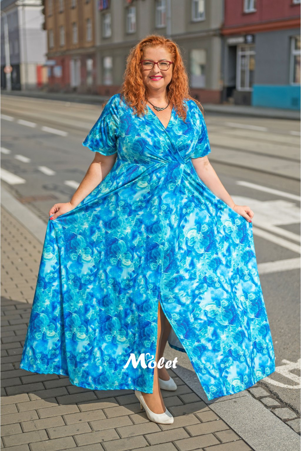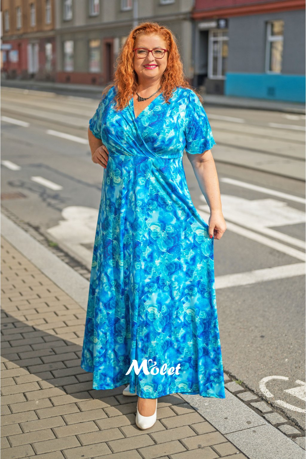 Krásné maxi zavinovací šaty z chladivého, pružného materiálu. Vrchní díl je s hlubokým přeloženým výstřihem, který se kříží na prsou. V pase jsou prostřižené a mají loketní zvonečkový rukáv. Sukně je šitá do áčka s překladem látky. Šaty nemají zip, nemačkají se a jsou pružné.