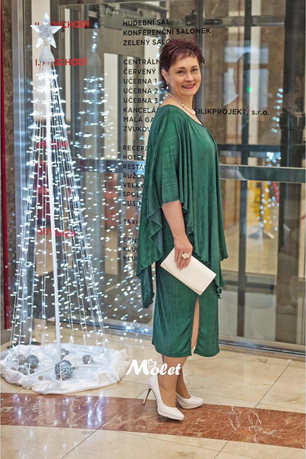 Naše plus size MOLETKA je vysoká cca 174 cm a má na sobě konfekční velikost 48 o délce 145 cm.