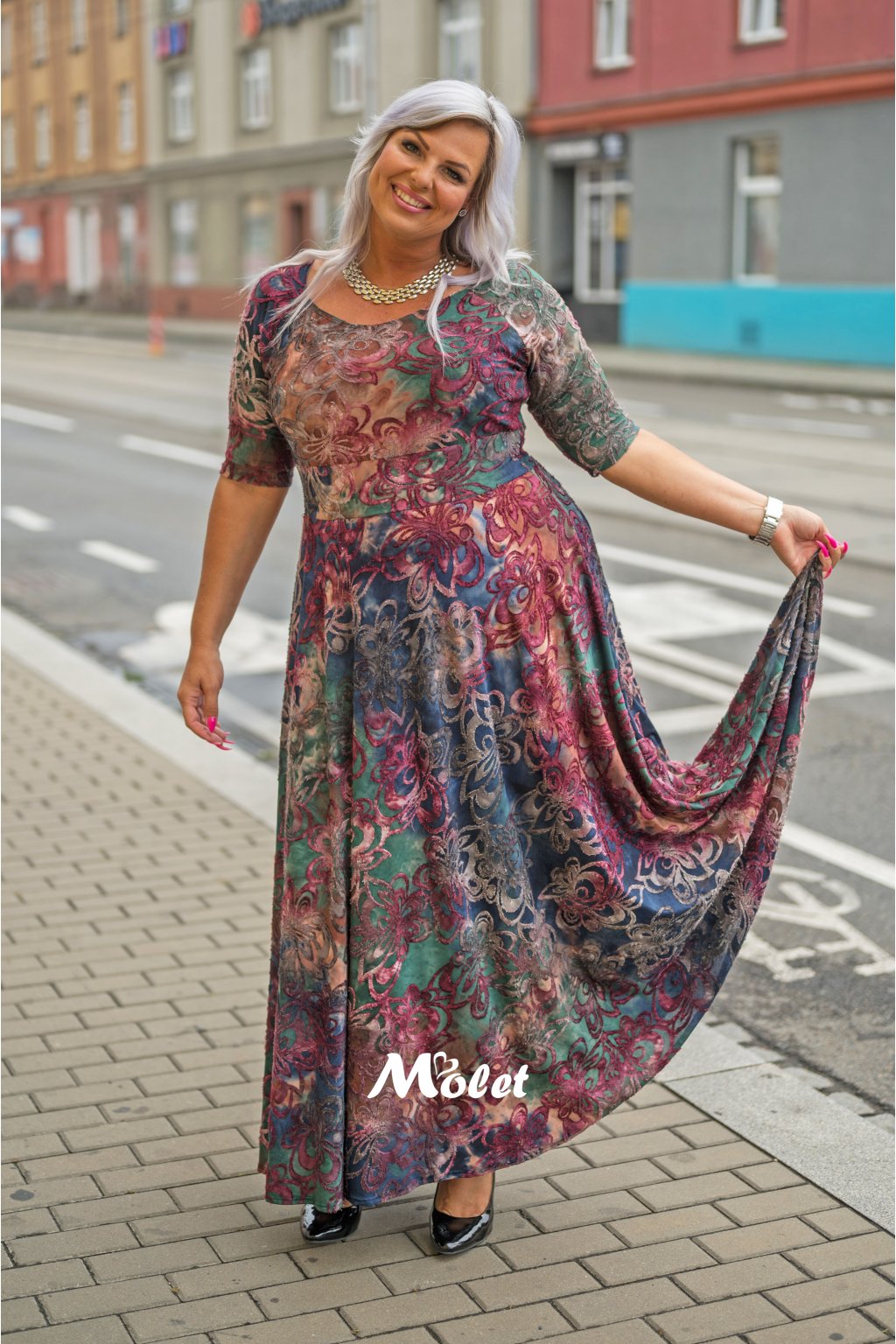 Naše MOLETKA je vysoká cca 177 cm a má na sobě konfekční velikost 50.