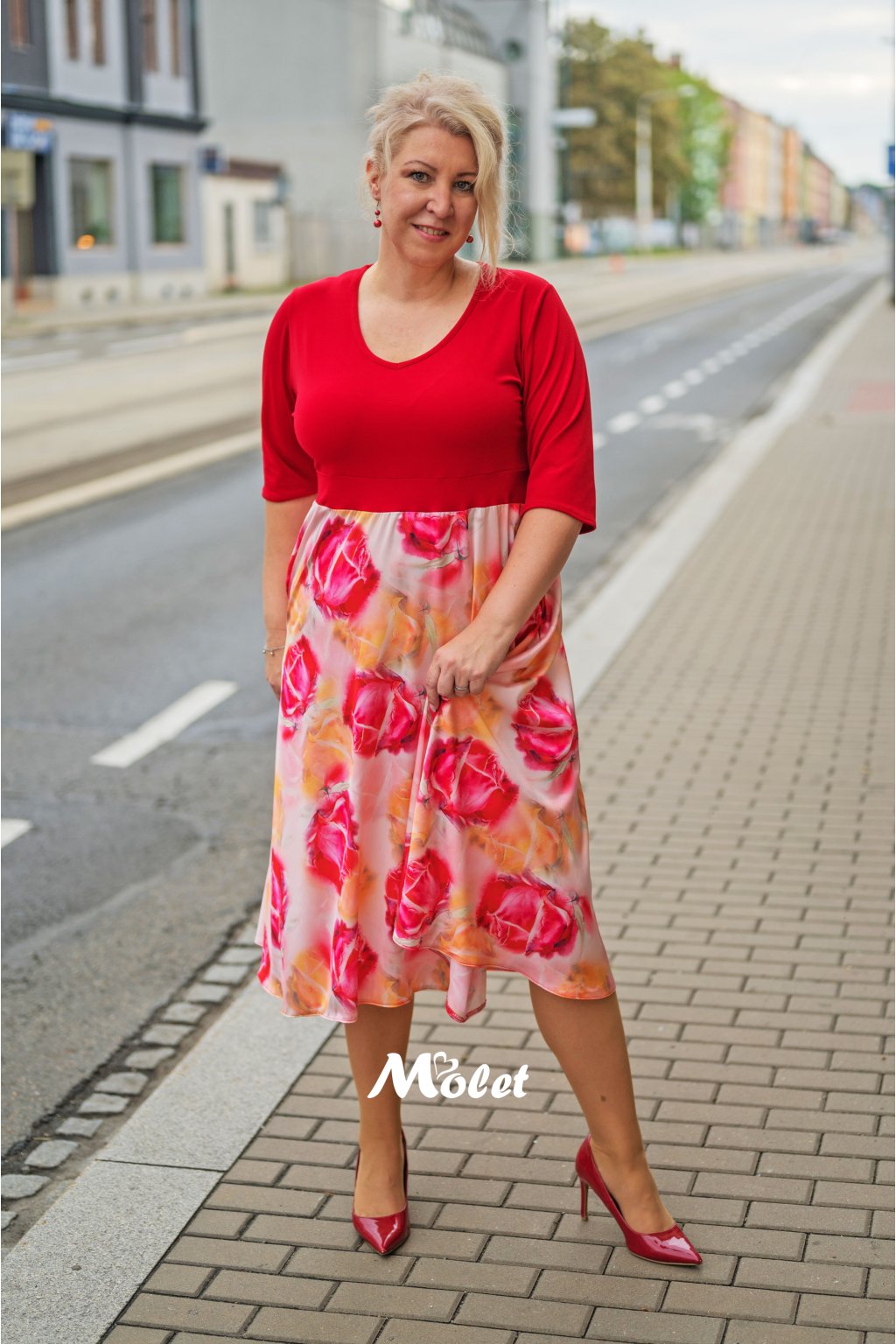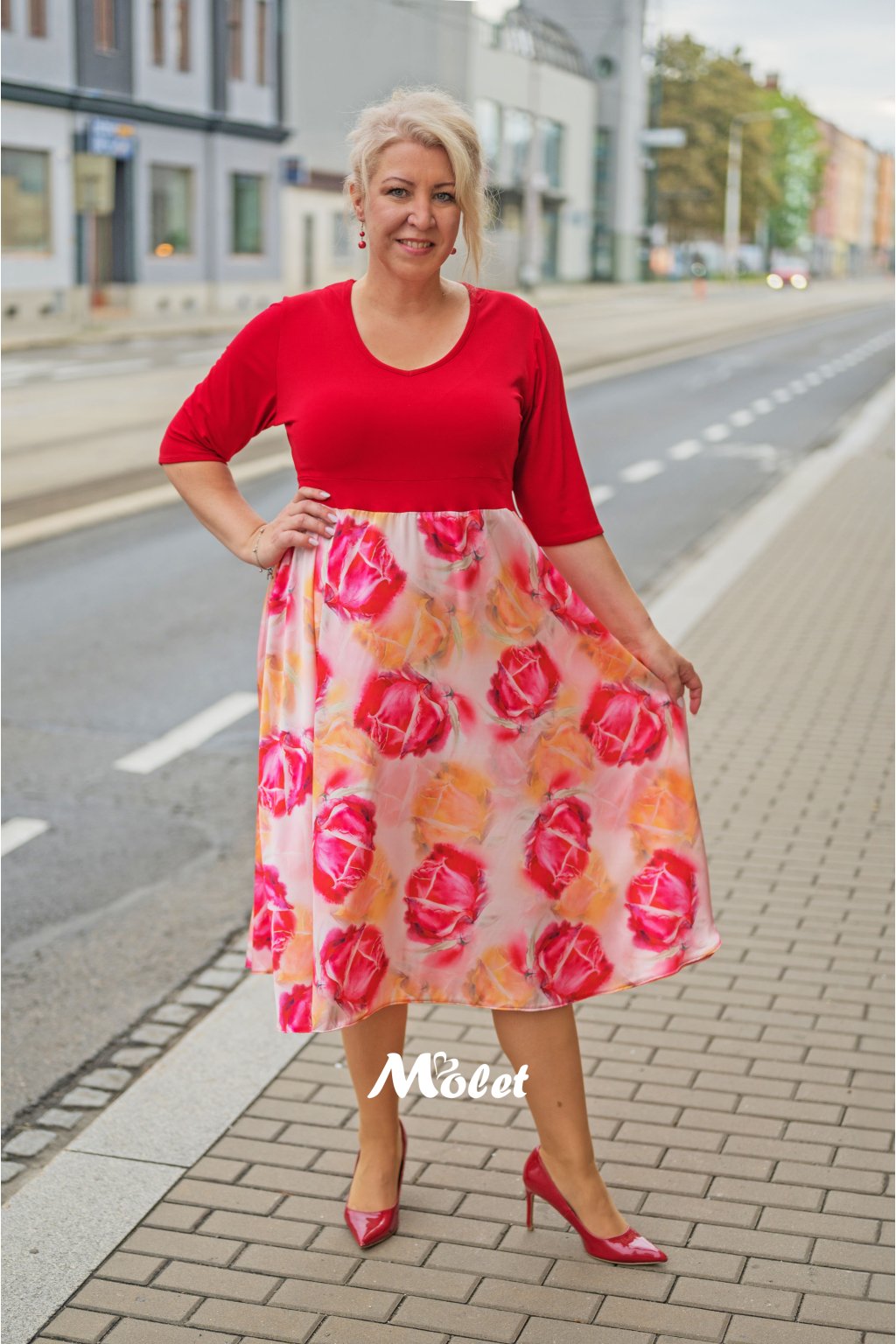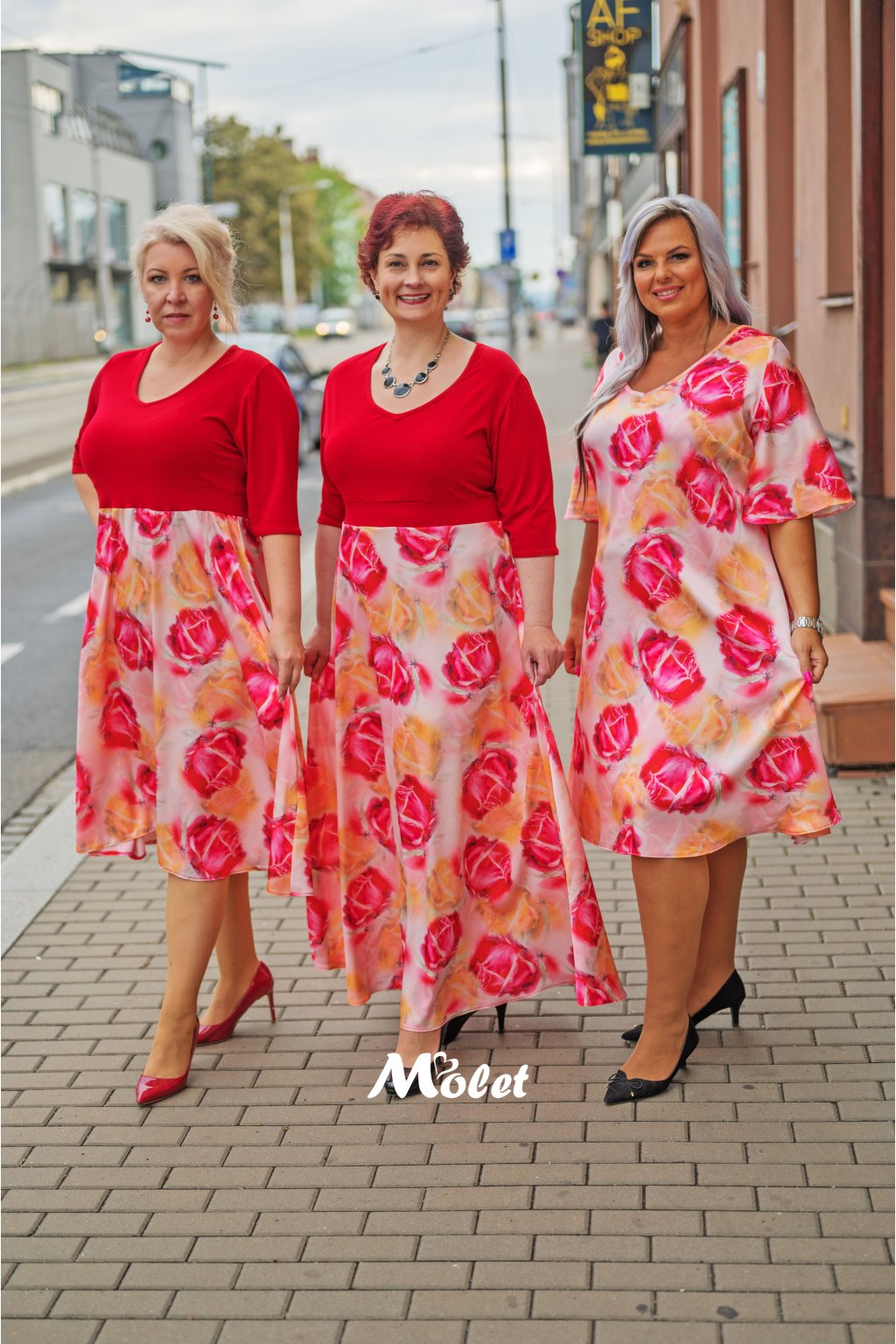 Krátké šaty s 3/4 rukávem a výstřihem do Vé. Sukně je šitá do áčka a je z krásné lehké látky s potiskem poupat růží. Šaty nemají zip v pase je středový pás. Krásný model, který se Vám zalíbí a okouzlíte v něm i Vaše okolí.