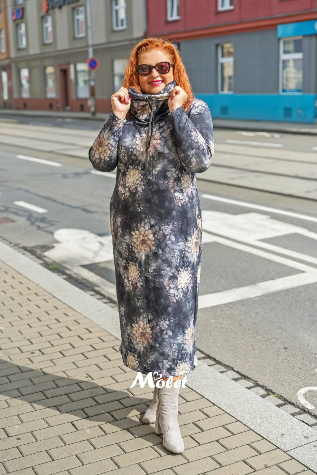 Dámské dlouhé teplejší sportovní bavlněné šaty s kulatými kapsami a rozparkem. Šaty jsou velmi pohodlné, krásně pruží a lichotí plnoštíhlé postavě. Mají efektní vysoký límec se šněrováním.