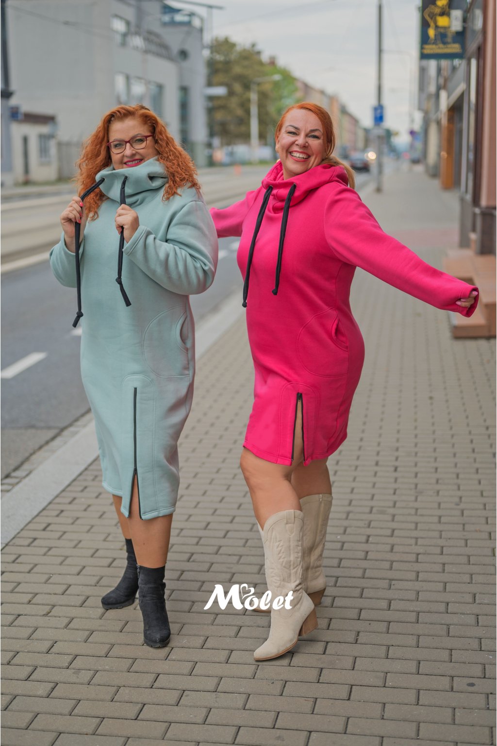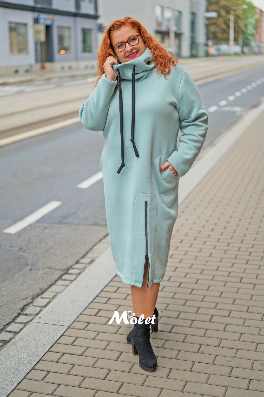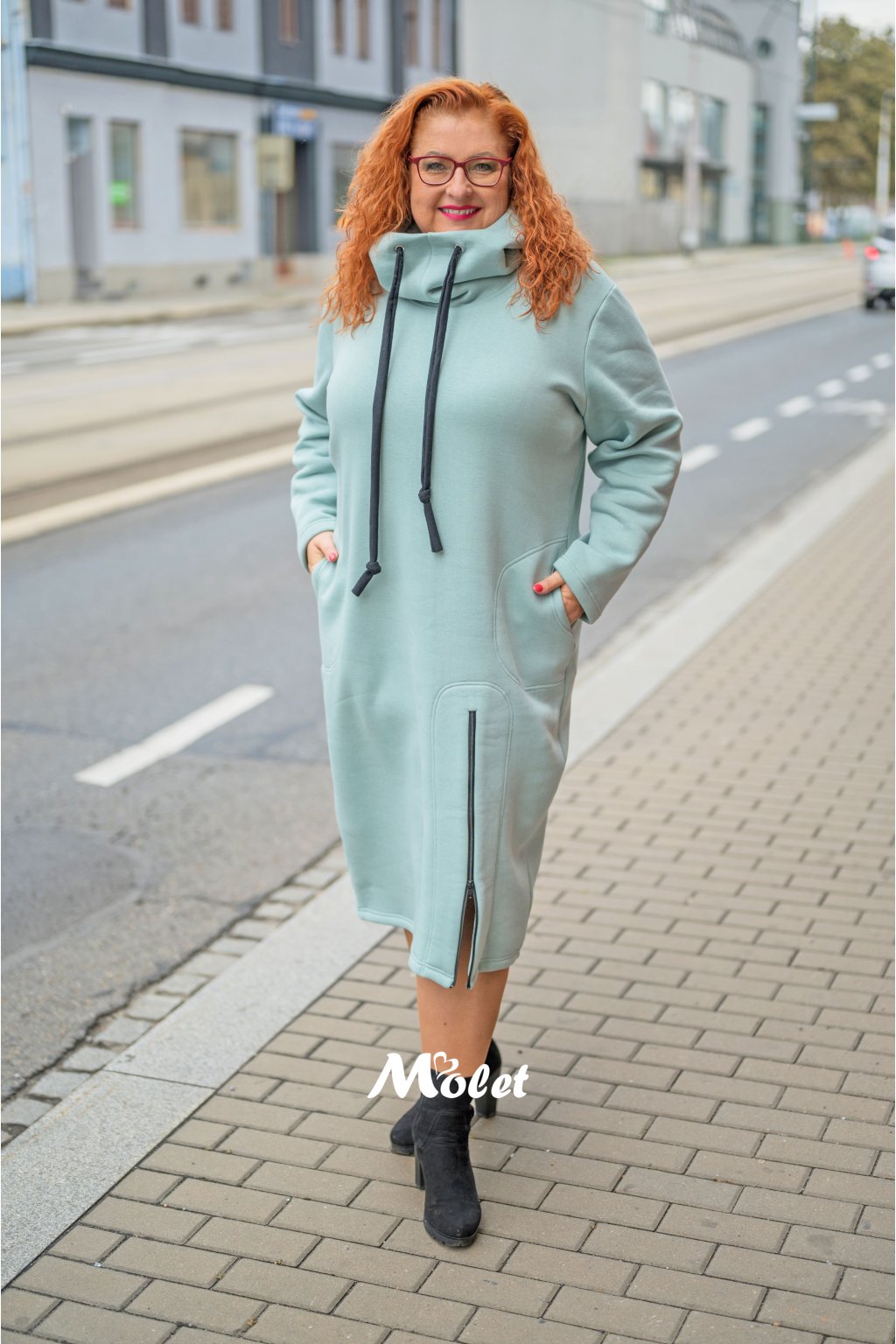 Naše MOLETKA je vysoká cca 176 cm a má na sobě konfekční velikost 52, délka jejich mikino šatů je 95 cm.