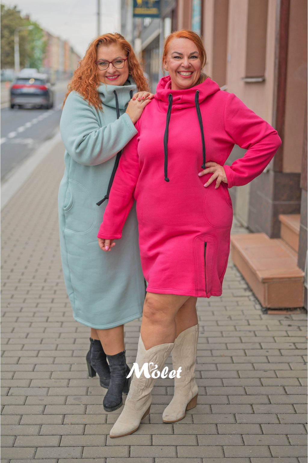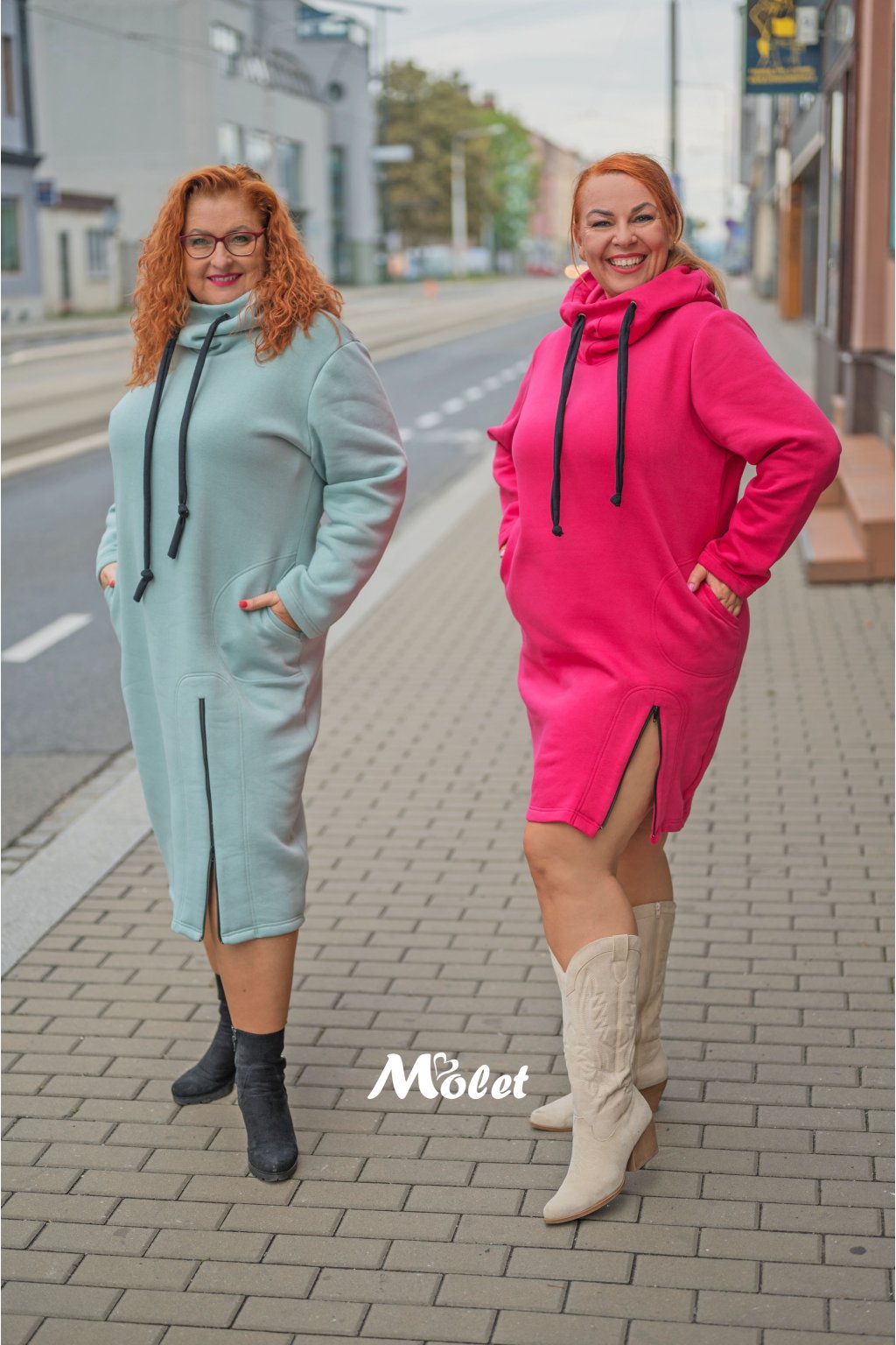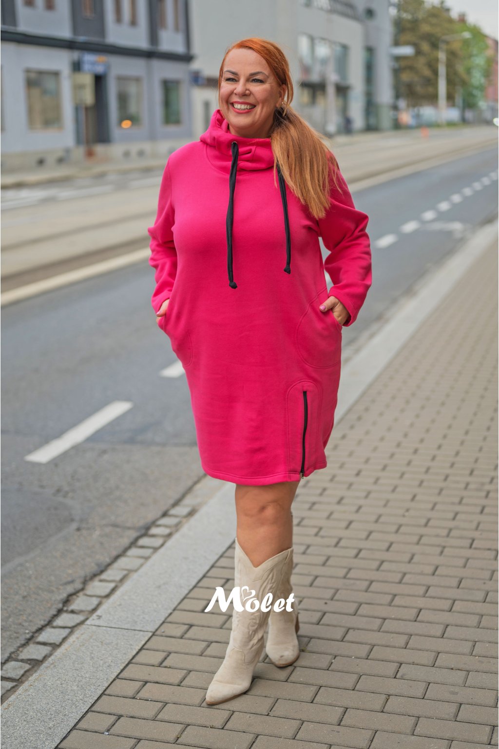 Naše MOLETKA je vysoká cca 176 cm a má na sobě konfekční velikost 52, délka jejich mikino šatů je 95 cm.