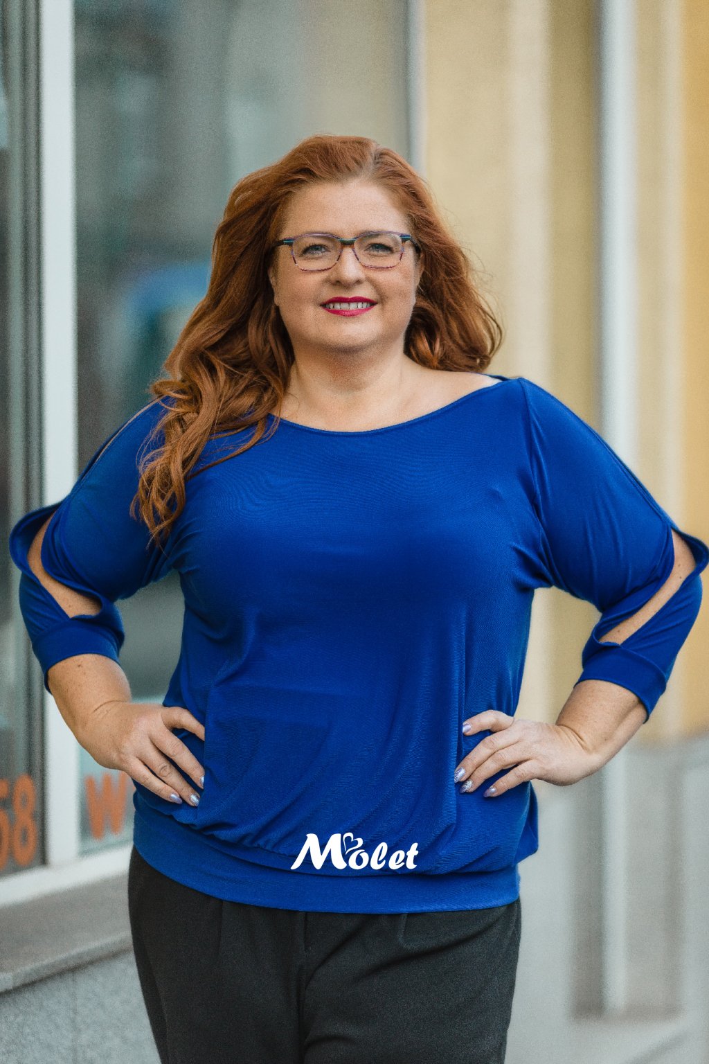 Naše MOLETKA je vysoká cca 174 cm a má na sobě konfekční velikost 48.