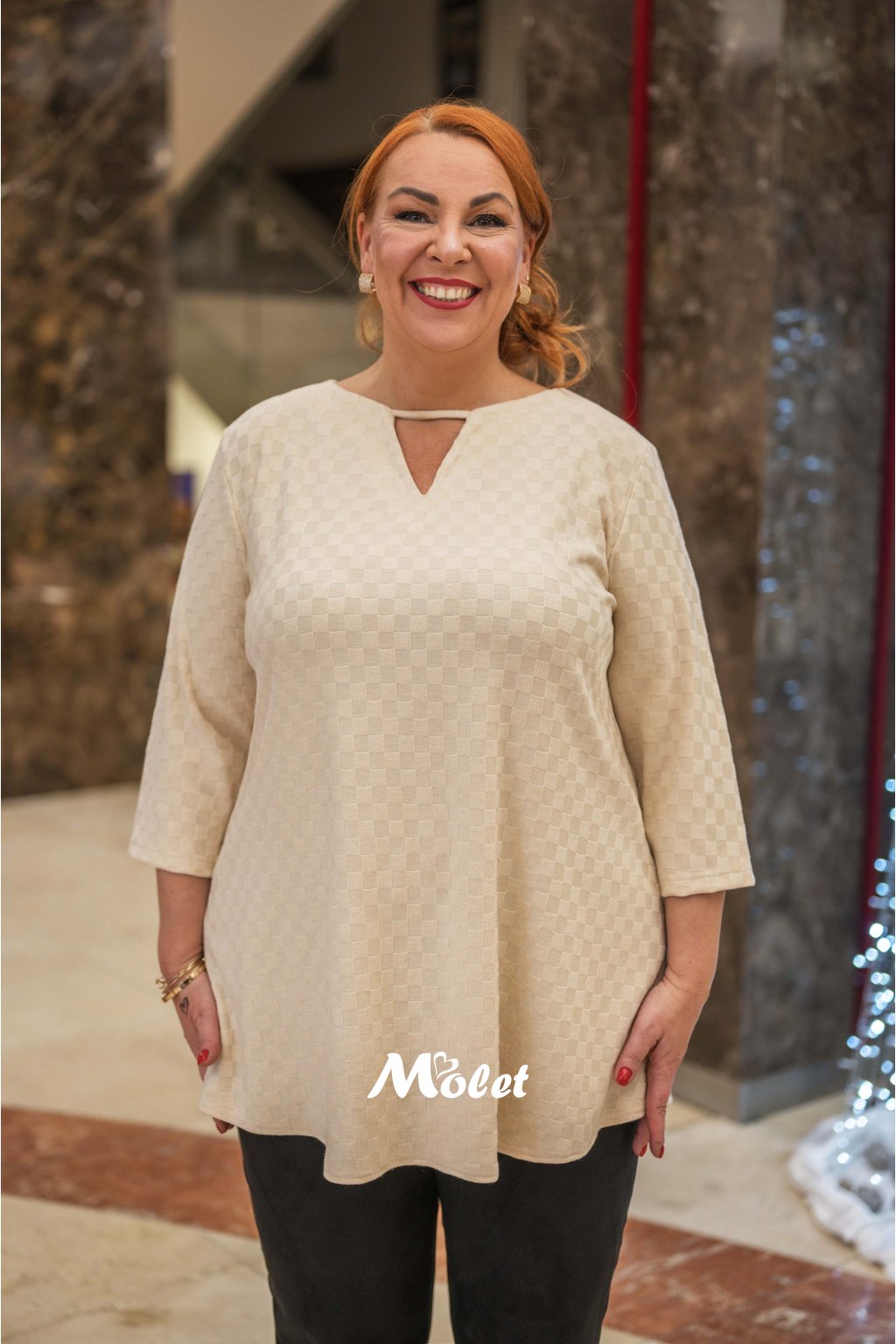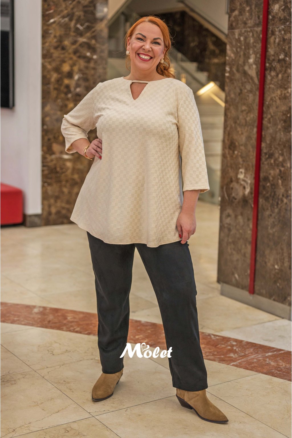 Naše MOLETKA je vysoká cca 175 cm a má na sobě velikost 50.